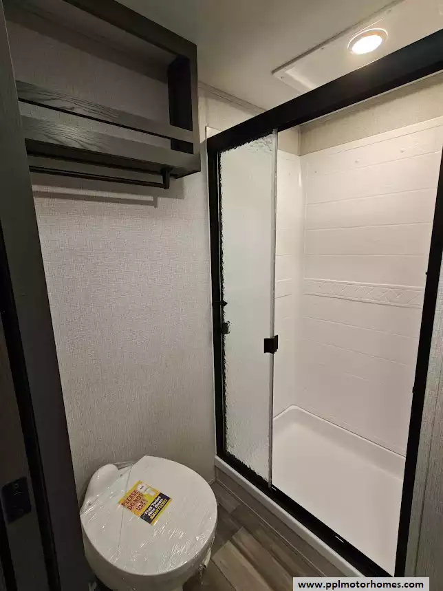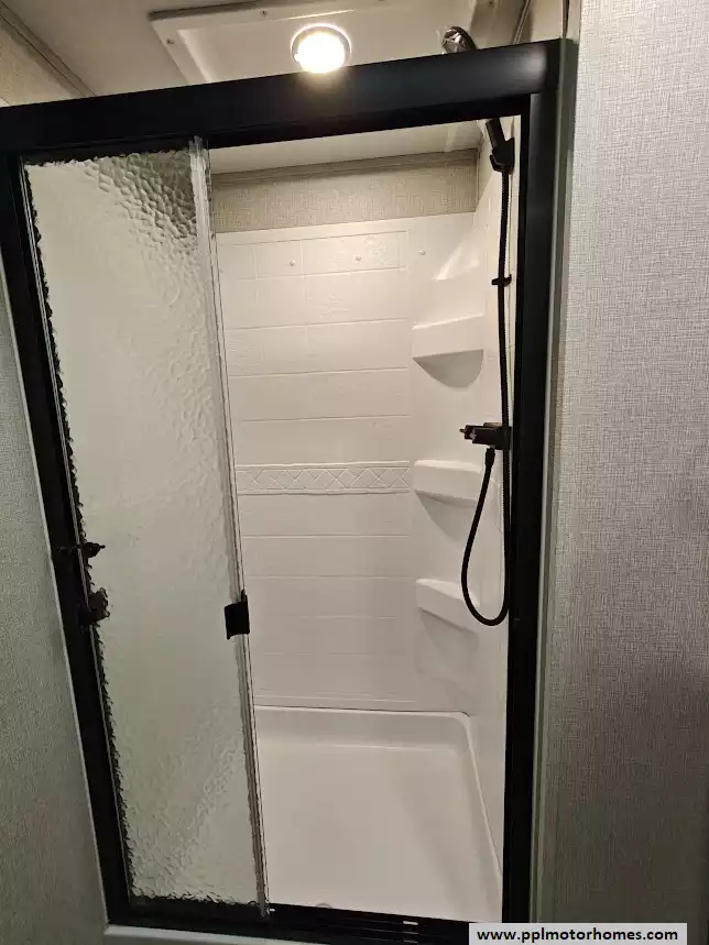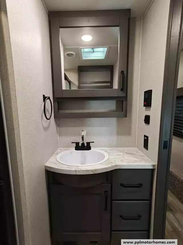 A large vanity top with a deep sink offers ample space for toiletries. A power vent fan helps manage humidity and air circulation.
