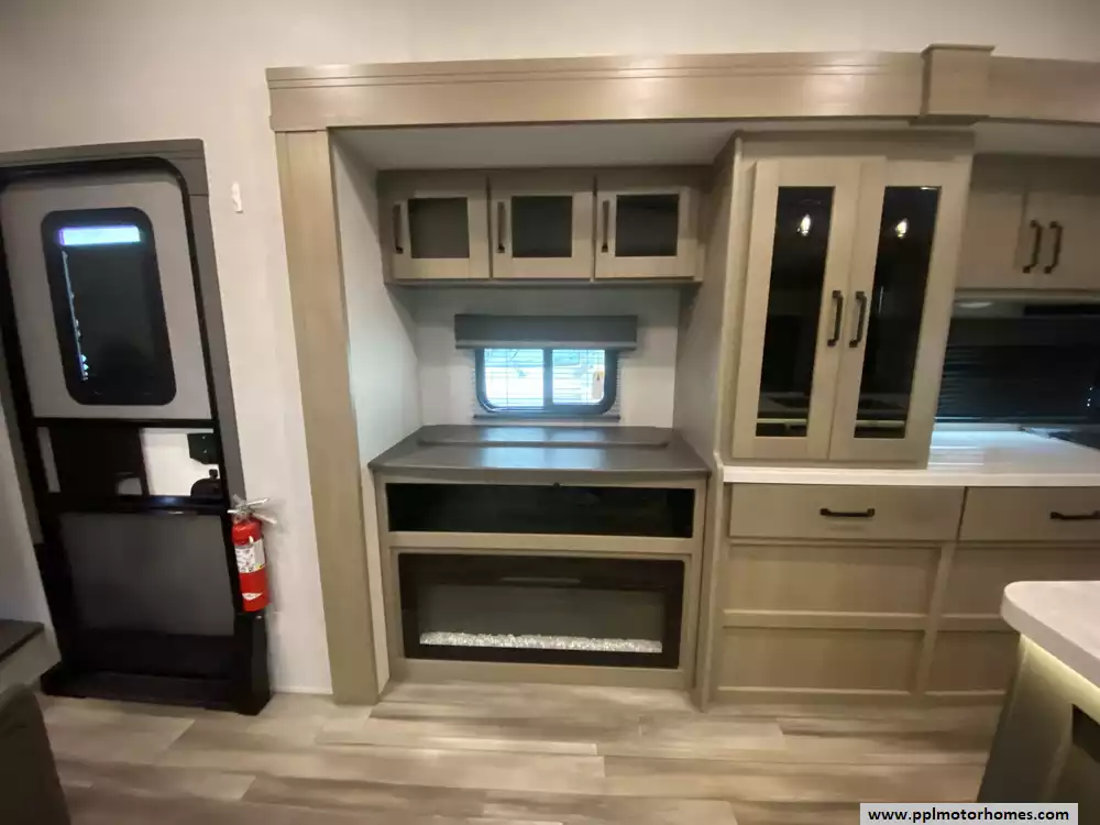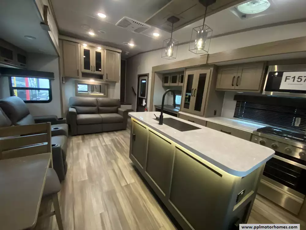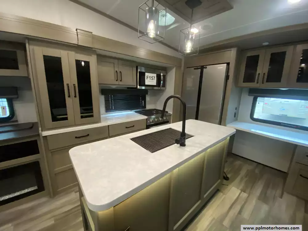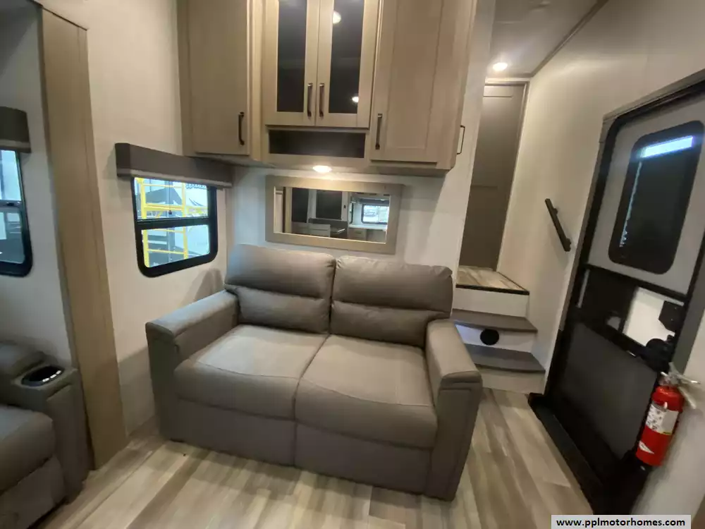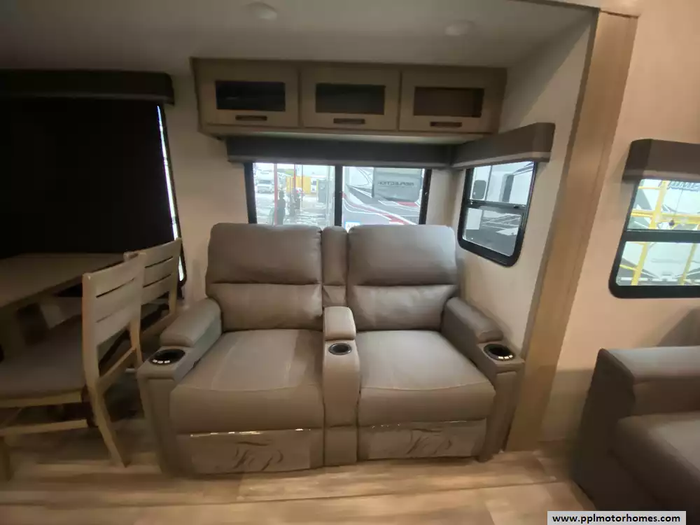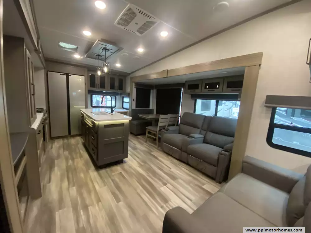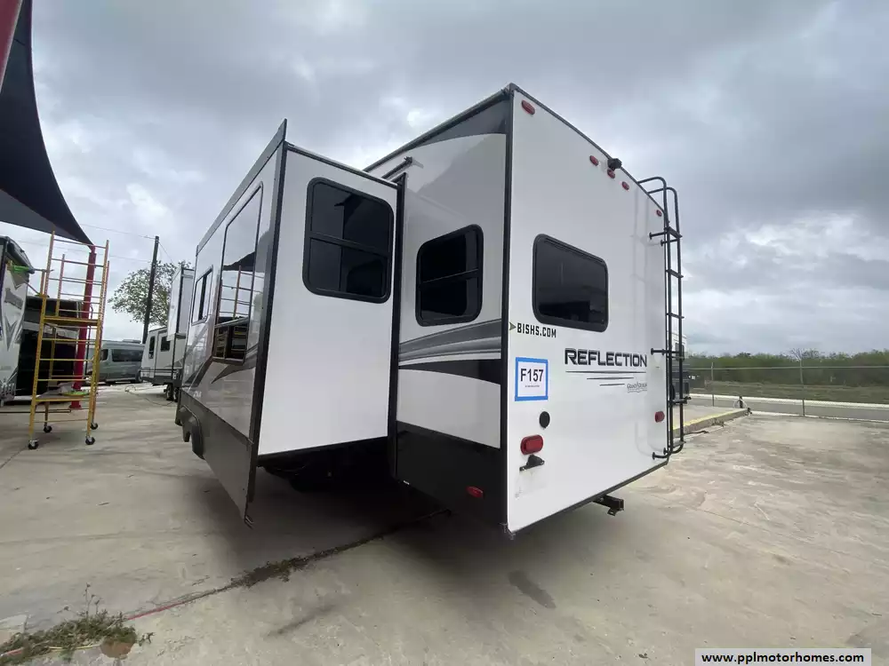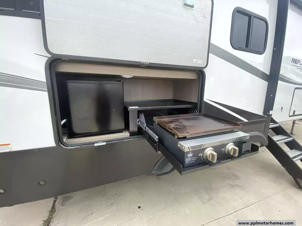 This 2024 Reflection 320MKS has an Electric Landing Gear, 3 Slide-outs, 2 Ducted Air Conditioners, Double Door 12v Furrion Refrigerator, Automatic Main Awning And Slide Awning, Washer/Dryer Connections, Solar Panel, TV, Outdoor Grill, Outdoor Kitchen, Outside Shower, Microwave, 3 Burner Range, Oven