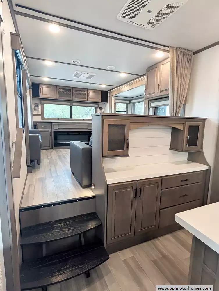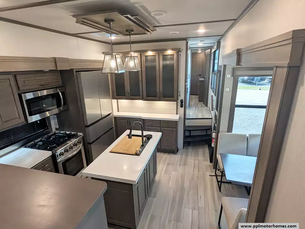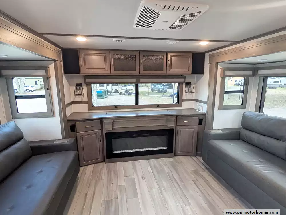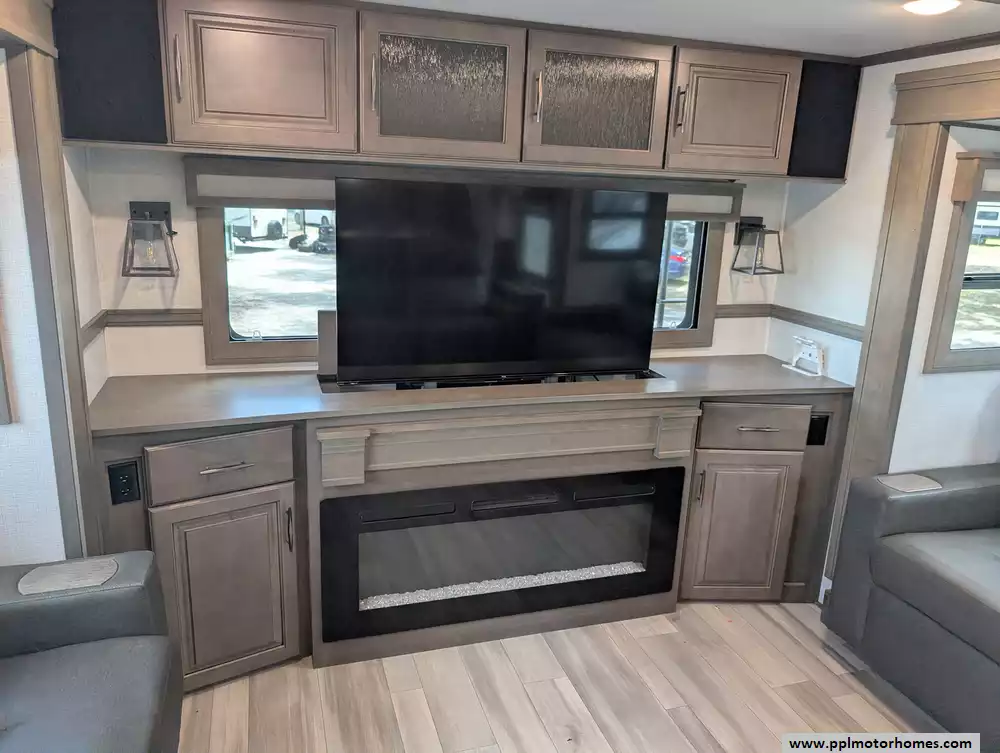 The interior is a showstopper for full-timers and luxury travelers alike, featuring a gourmet kitchen anchored by a four-door residential Furrion refrigerator with an in-fridge ice maker, a four-burner range, an oven, and a microwave. This coach is fully optimized for the modern nomad, coming complete with a washer and dryer, a central vacuum system, and an integrated solar panel for added power independence. Stay entertained and connected with two TVs, a satellite receiver, and the warmth of a cozy built-in fireplace. With thoughtful touches like an outside shower and high-end finishes throughout, this 2024 Solitude 376RD represents the gold standard in high-end fifth-wheel living.
