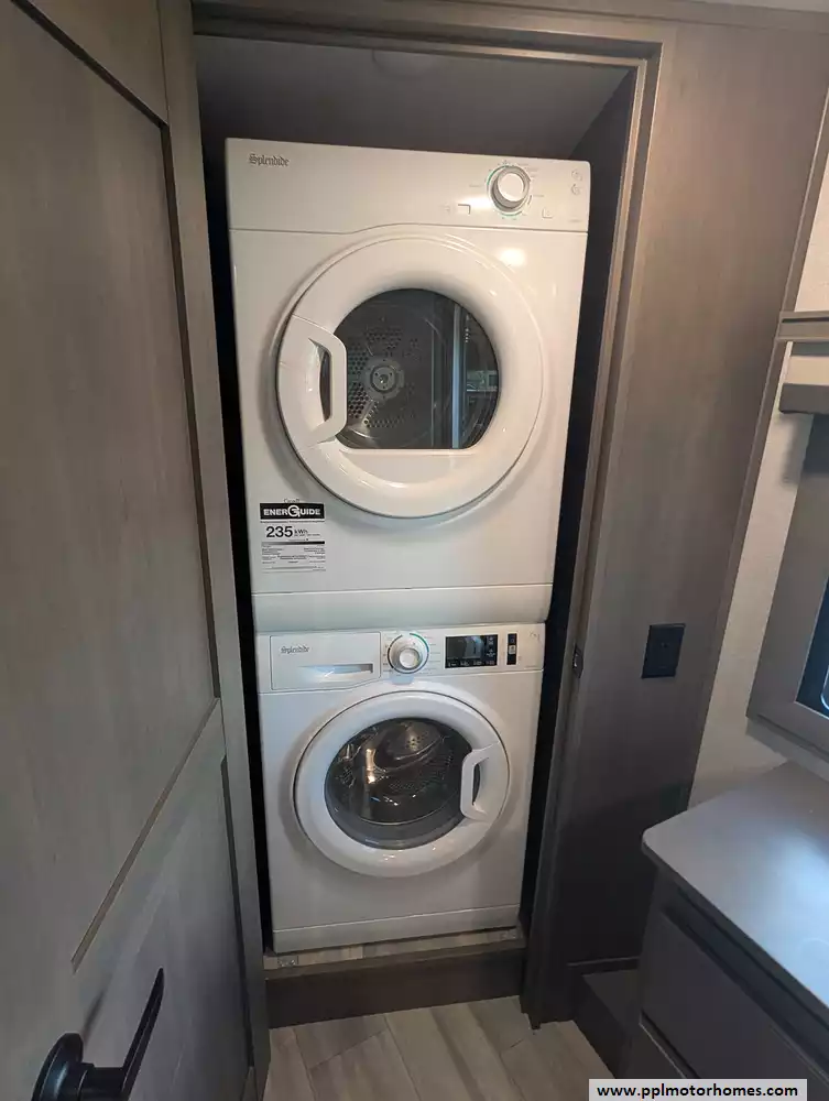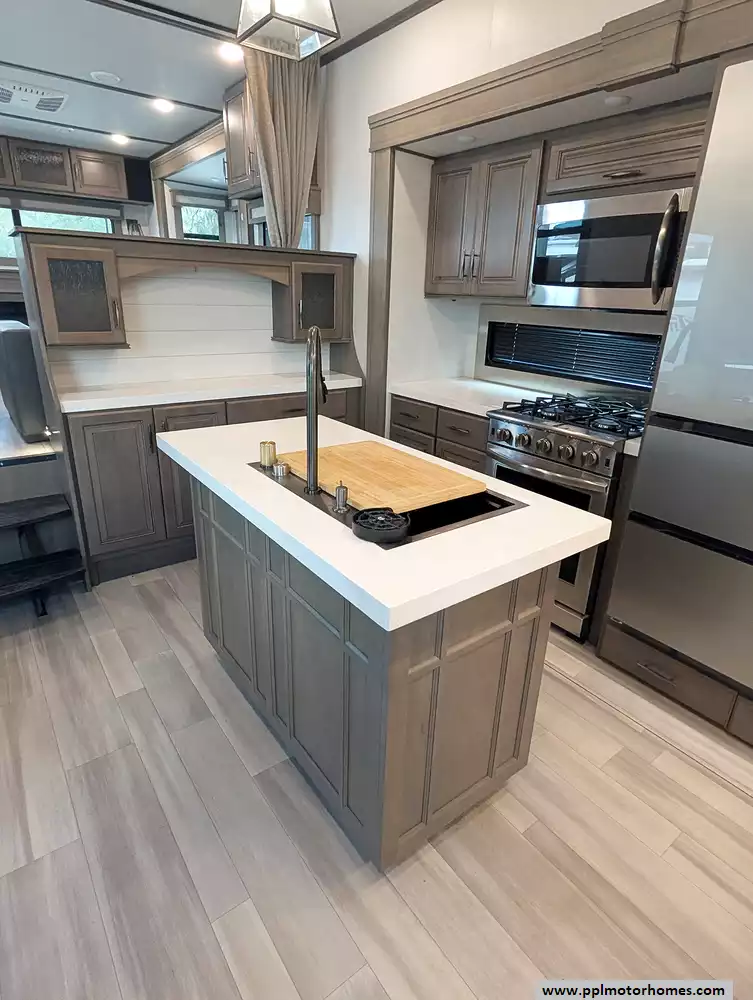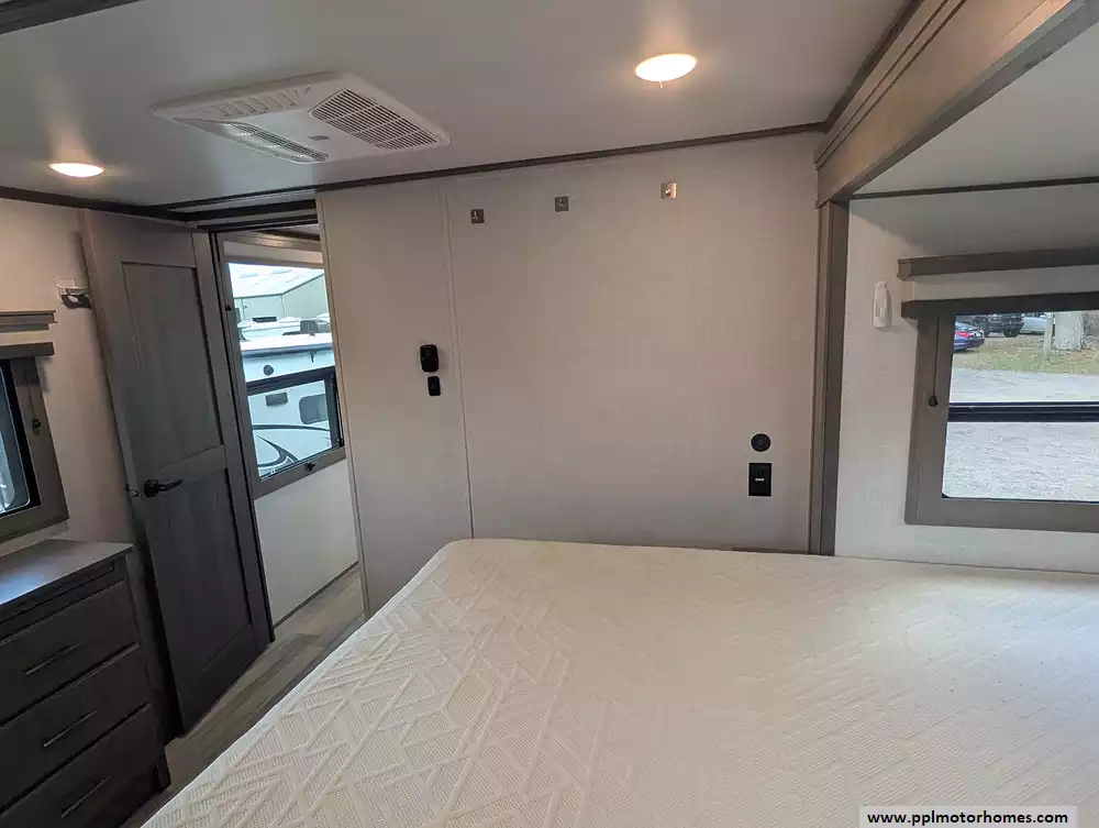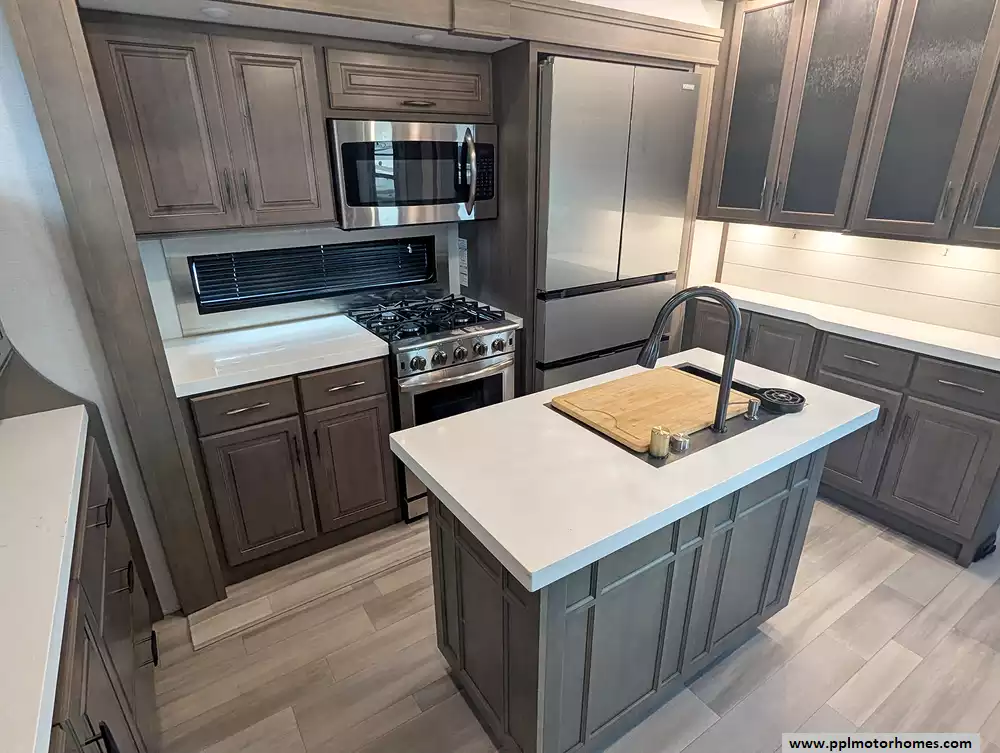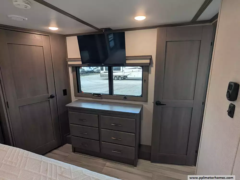 The interior is a showstopper for full-timers and luxury travelers alike, featuring a gourmet kitchen anchored by a four-door residential Furrion refrigerator with an in-fridge ice maker, a four-burner range, an oven, and a microwave. This coach is fully optimized for the modern nomad, coming complete with a washer and dryer, a central vacuum system, and an integrated solar panel for added power independence. Stay entertained and connected with two TVs, a satellite receiver, and the warmth of a cozy built-in fireplace. With thoughtful touches like an outside shower and high-end finishes throughout, this 2024 Solitude 376RD represents the gold standard in high-end fifth-wheel living.