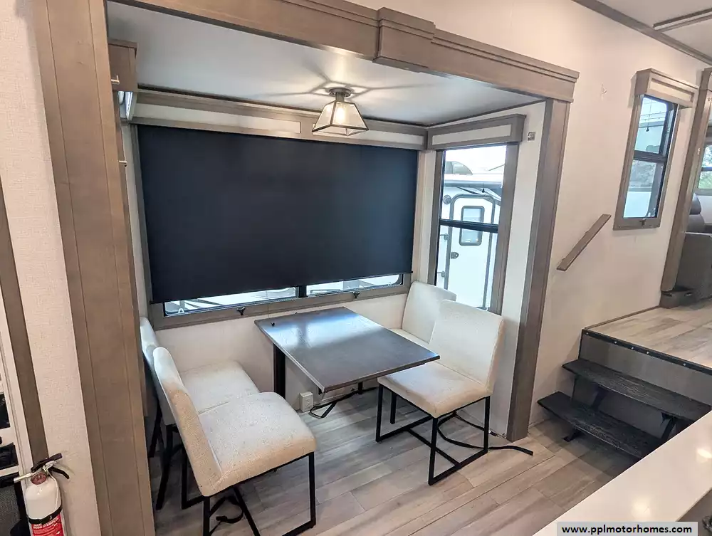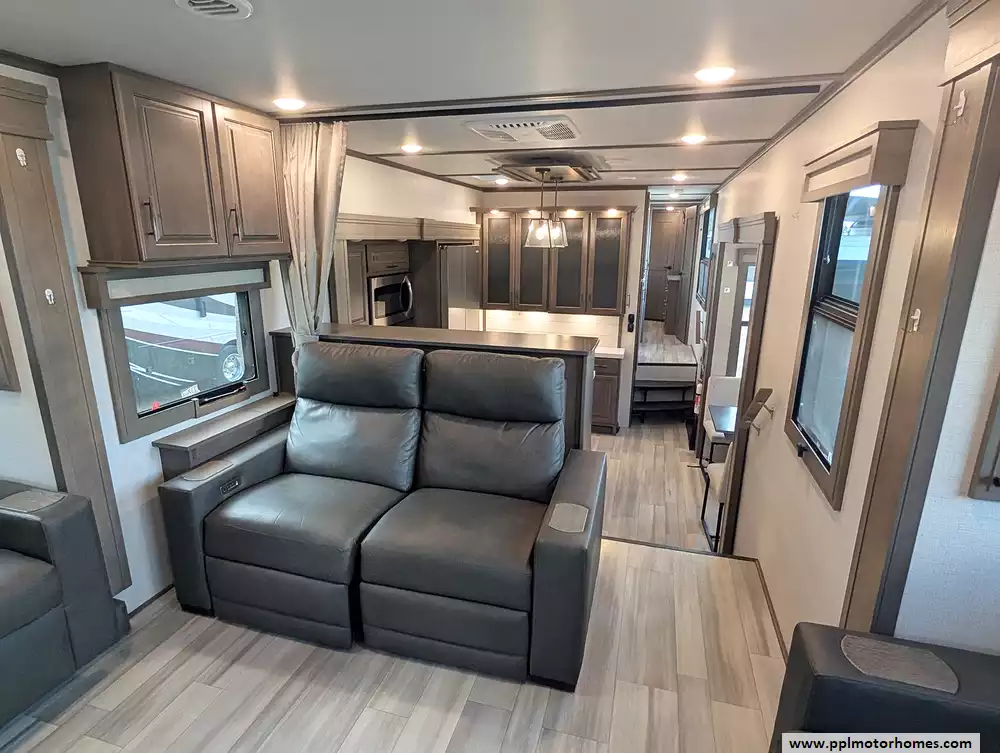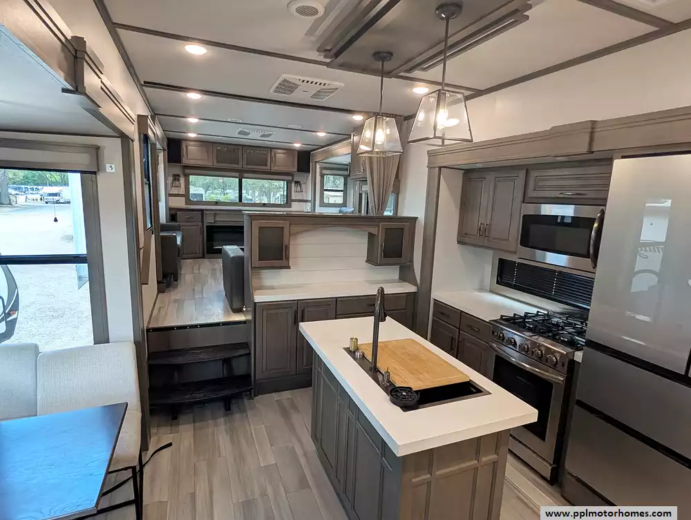 Experience the pinnacle of luxury with the 2024 Grand Design Solitude 376RD, a 42-foot fifth wheel masterfully designed for those who refuse to compromise on comfort. This model is celebrated for its unique elevated rear-den floorplan, which provides a dedicated living space and massive exterior storage capacity that feels like a true residential home. Built with a durable fiberglass body and a rubber roof, the coach utilizes five expansive slide-outs and a wide-body construction to maximize every inch of interior volume. Setting up camp is effortless with the hydraulic landing gear, while the automatic main awning and outside speakers set the stage for premium outdoor relaxation. To ensure a comfortable journey in any season, this Solitude is equipped with heated tanks and three ducted air conditioners to maintain the perfect climate year-round.