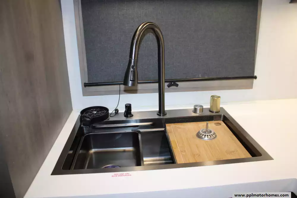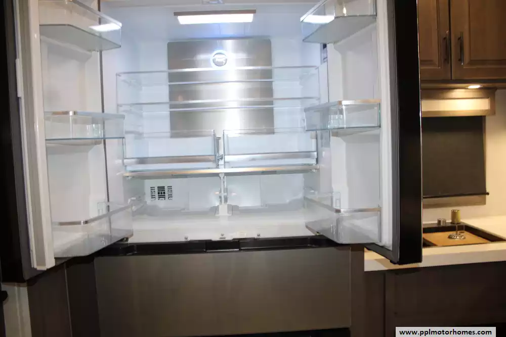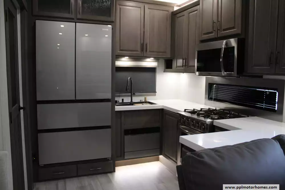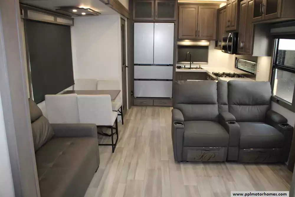 Measuring just under 42 feet in length with multiple slide-outs, it offers a wide-body design that maximizes interior space, including a large gourmet kitchen with solid-surface countertops, an oversized pantry, residential appliances, and a freestanding dinette.