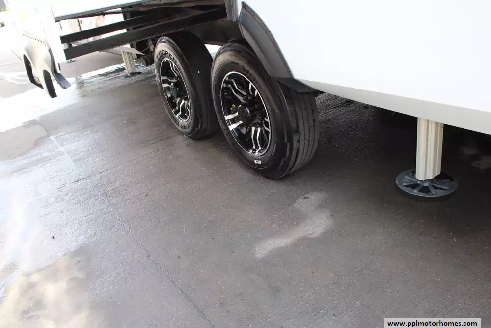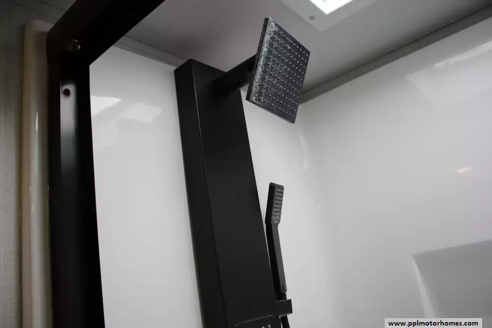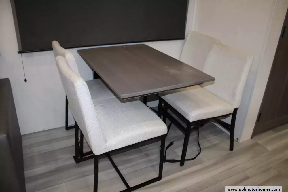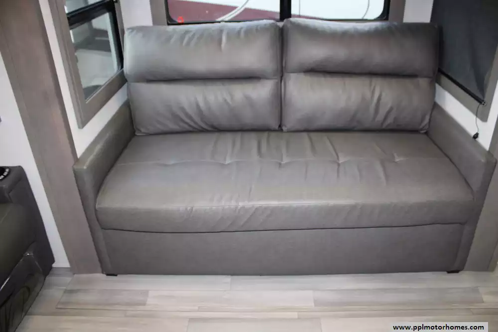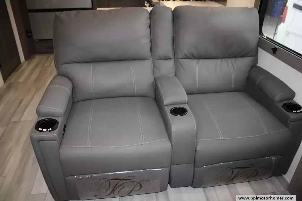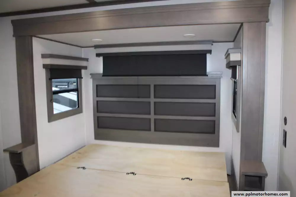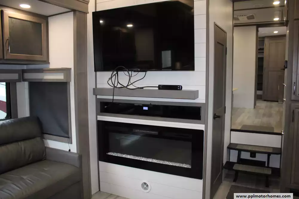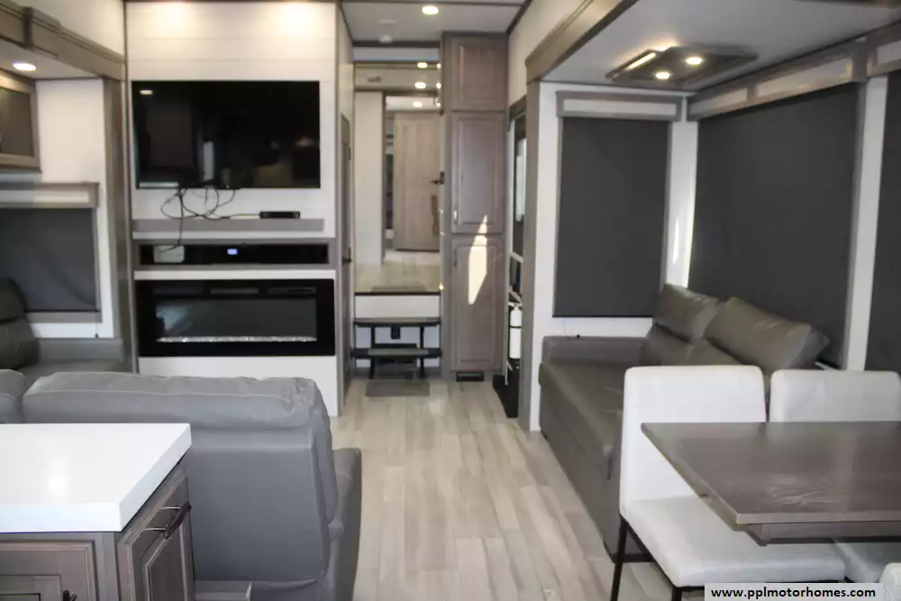 The living area is outfitted with theater seating, dual sofas, an entertainment center, and a fireplace, creating a comfortable, home-like atmosphere, while two bathrooms add convenience for longer trips. Built on a durable drop-frame chassis with four-season insulation, heated underbelly, and high-capacity HVAC systems, the 417KB is engineered for year-round use, combining luxury finishes, ample storage, and modern technology to accommodate up to four occupants in comfort.