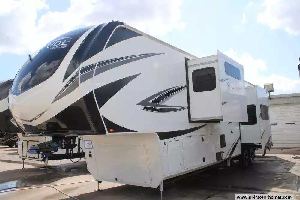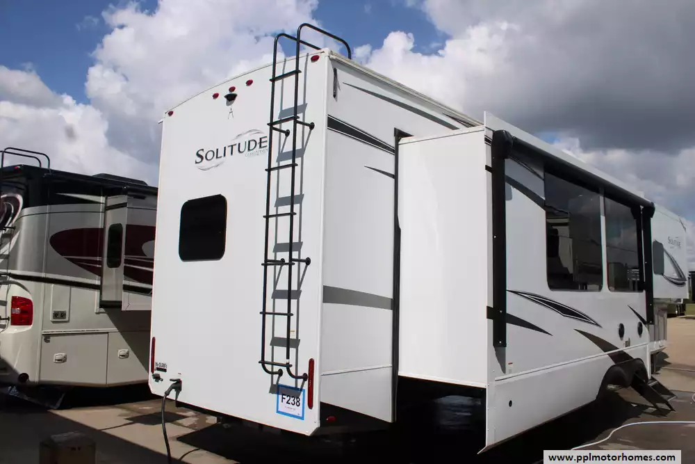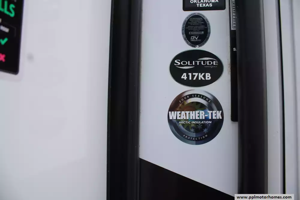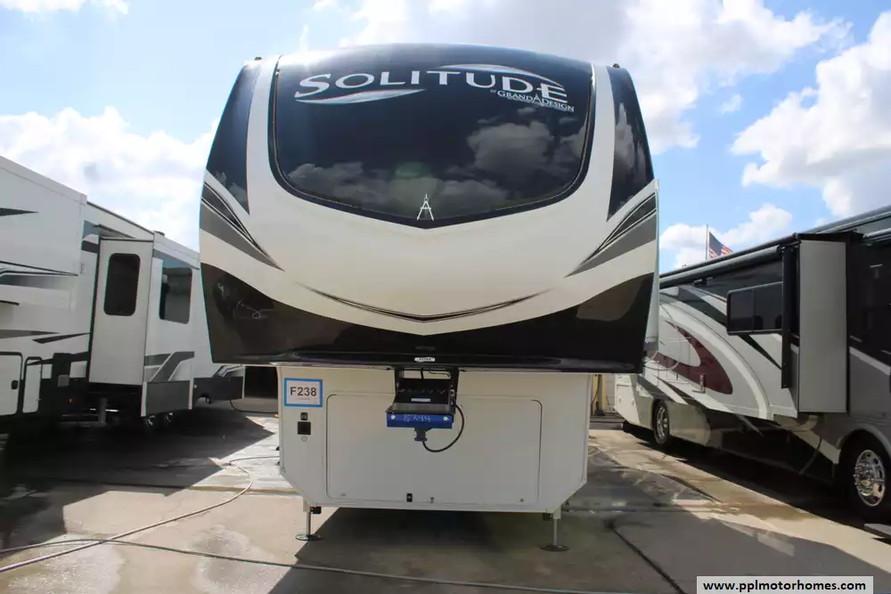 The 2024 Grand Design Solitude 417KB is a premium, residential-style fifth-wheel RV designed for extended stays and full-time living, featuring a spacious rear kitchen floorplan paired with a central living area, bath and a half, and a private front bedroom. This model also includes generator prep.