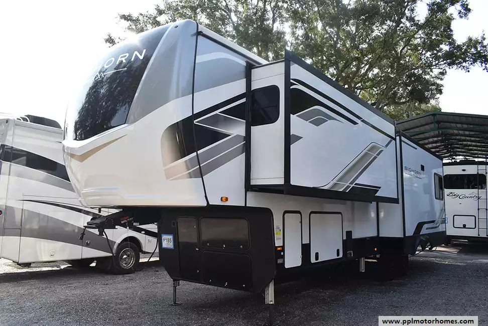 This 2024 Bighorn 3700RL has a Hydraulic Landing Gear, 3 Slide-outs, 2 Ducted Air Conditioners, 4 Door Residential Furrion Refrigerator, In-Fridge Ice Maker, Automatic Main Awning, Washer/Dryer Connections, Dishwasher, Outside Speakers, TV, Outside Shower, Fireplace, Convection Microwave, 3 Burner Range, Oven
