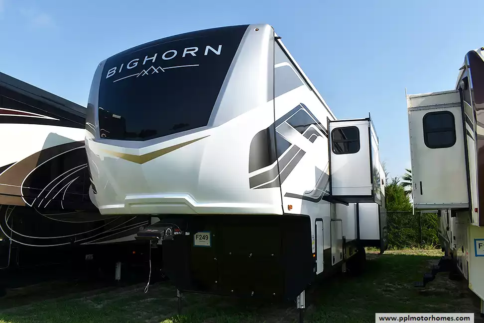 This 2024 Heartland Bighorn 3910FB is a luxurious fifth wheel featuring a full shower and half bath for added convenience. It is solar ready and offers theater seating for comfortable lounging. The unit includes a spacious walk-in closet and washer and dryer connections, providing a home-like living experience on the road.