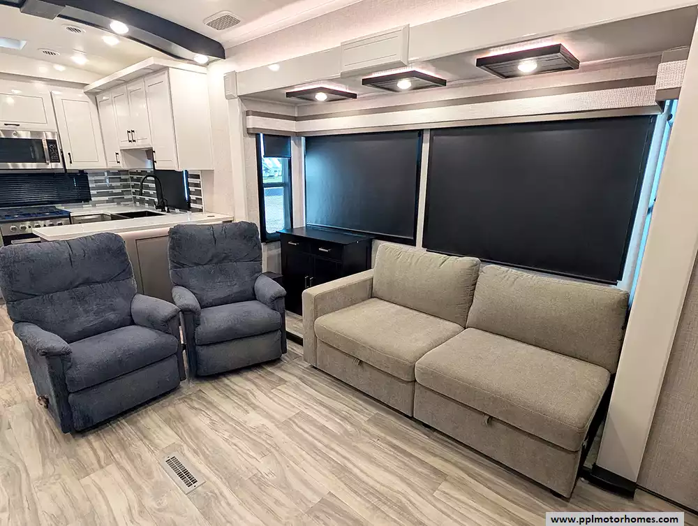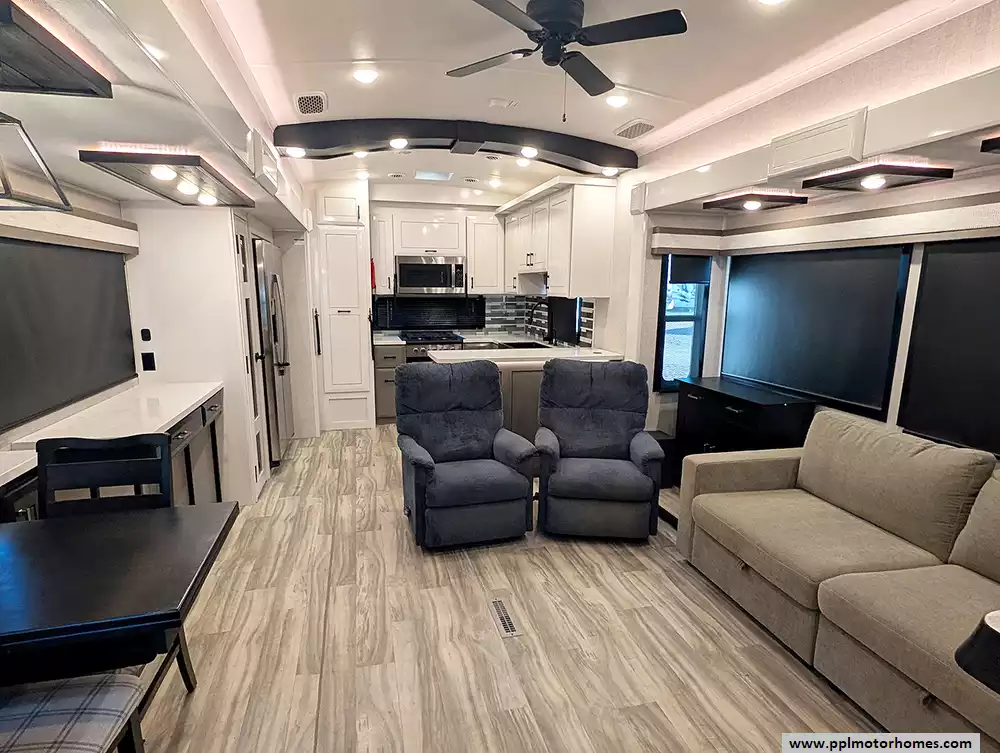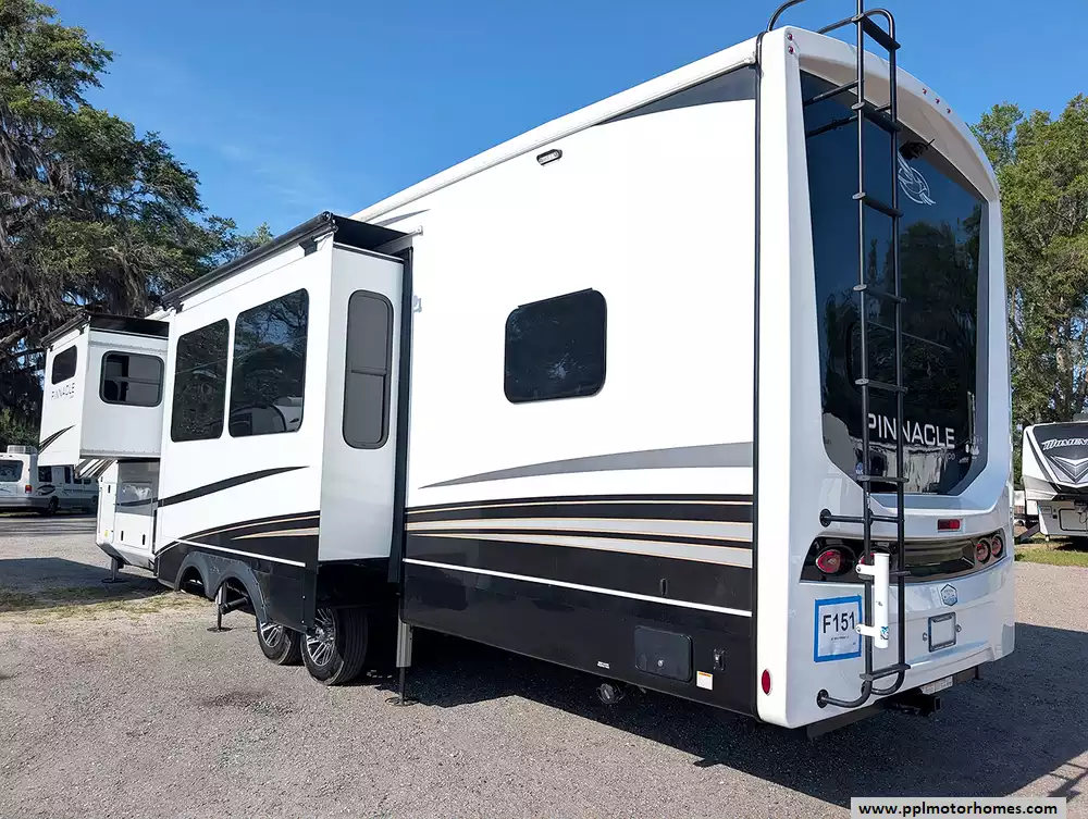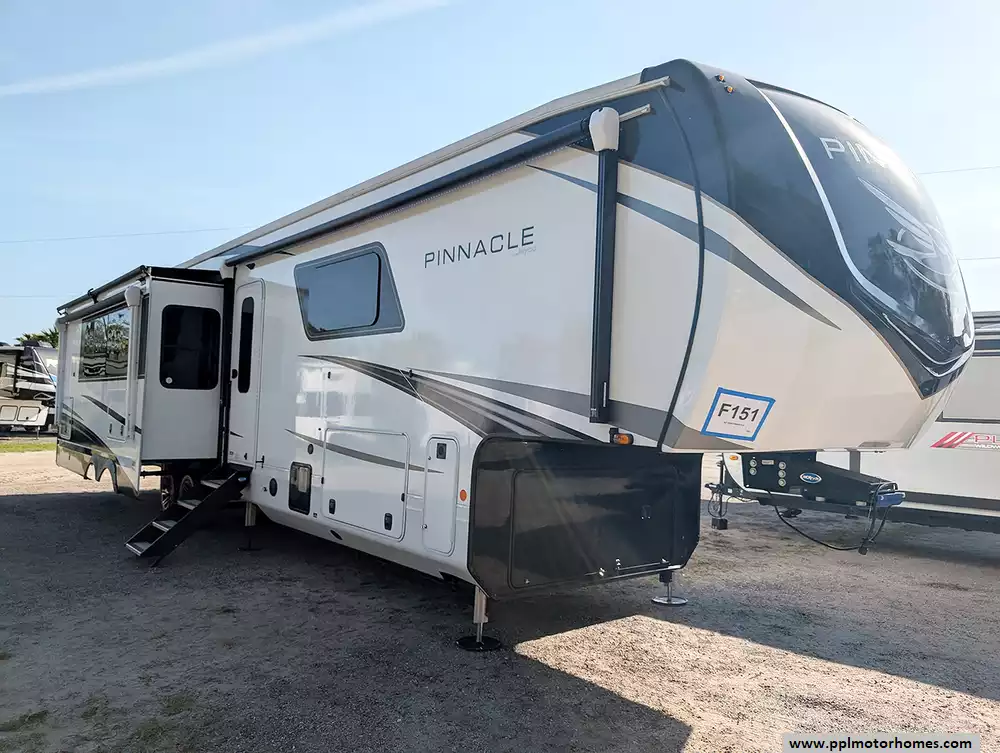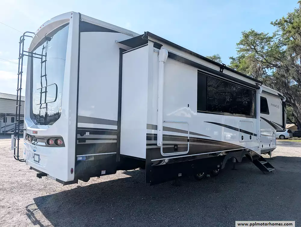 The 38FBRK is expertly equipped for extended stays and effortless setup, featuring a six-point hydraulic landing gear system and an automatic main awning complemented by window and slide-out awnings. This unit is truly a home on wheels, offering a central vacuum system, washer and dryer connections, and a solar panel for off-grid versatility. Climate control is managed by three ducted air conditioners, ensuring every corner stays cool even in peak summer. Outdoor living is just as refined with an integrated outside entertainment system and a convenient outside shower. From the massive front master bathroom to the high-end finishes, this Pinnacle offers the perfect blend of residential elegance and rugged durability for those who refuse to compromise on the road.