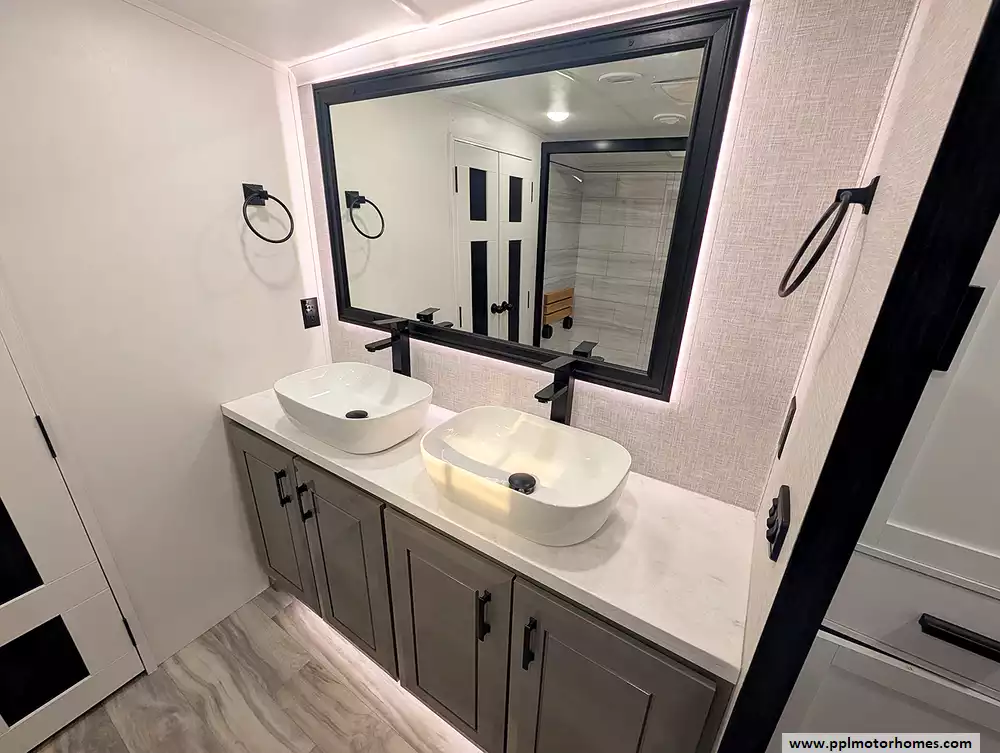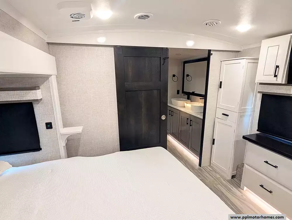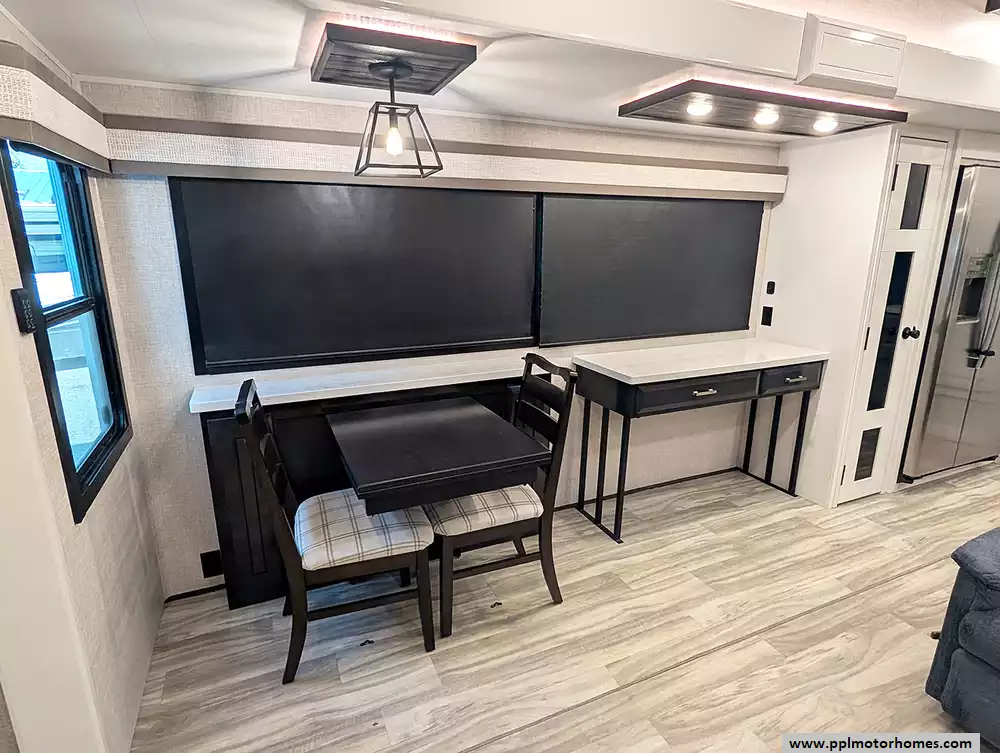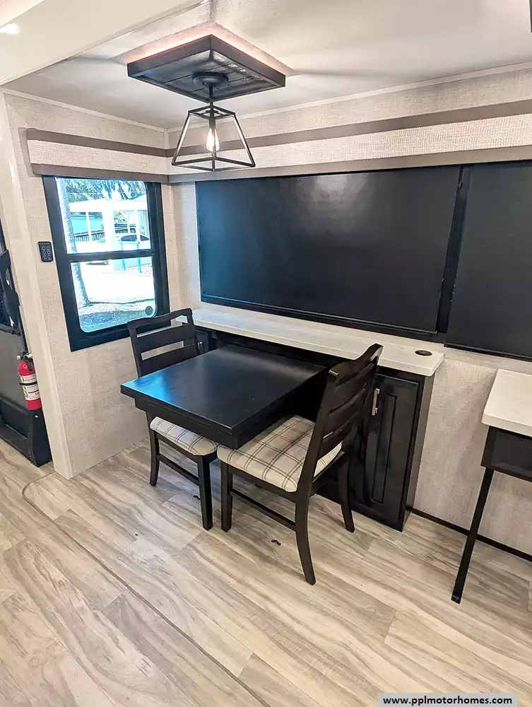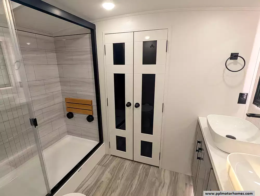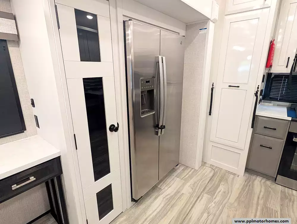 The 38FBRK is expertly equipped for extended stays and effortless setup, featuring a six-point hydraulic landing gear system and an automatic main awning complemented by window and slide-out awnings. This unit is truly a home on wheels, offering a central vacuum system, washer and dryer connections, and a solar panel for off-grid versatility. Climate control is managed by three ducted air conditioners, ensuring every corner stays cool even in peak summer. Outdoor living is just as refined with an integrated outside entertainment system and a convenient outside shower. From the massive front master bathroom to the high-end finishes, this Pinnacle offers the perfect blend of residential elegance and rugged durability for those who refuse to compromise on the road.