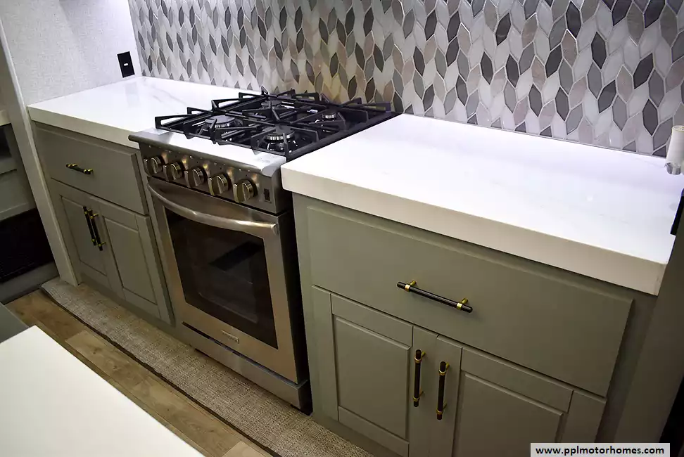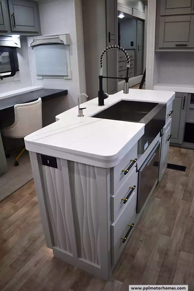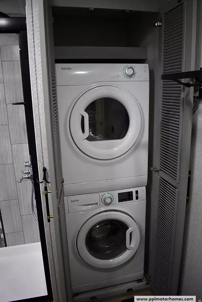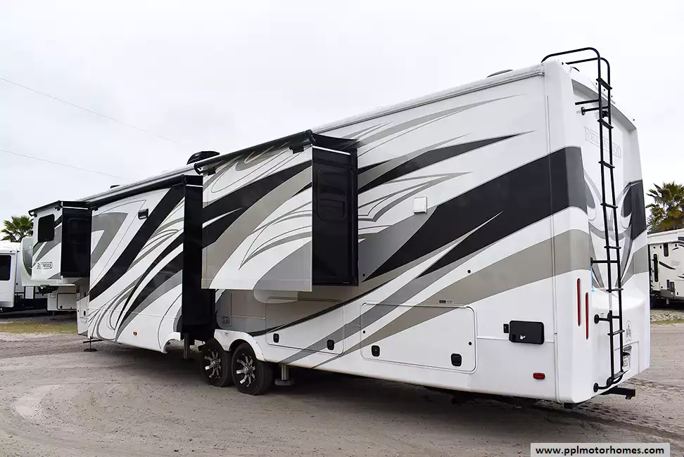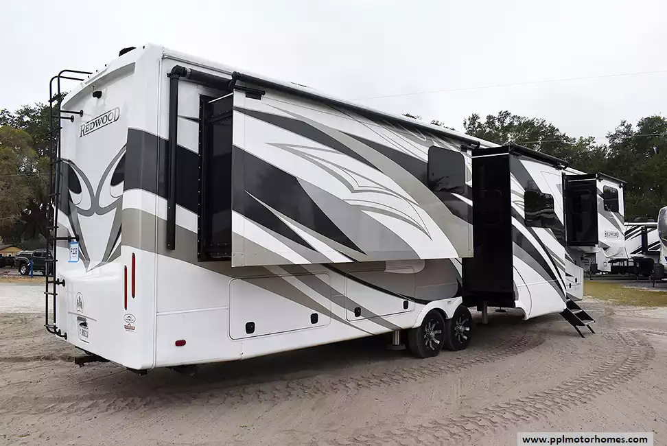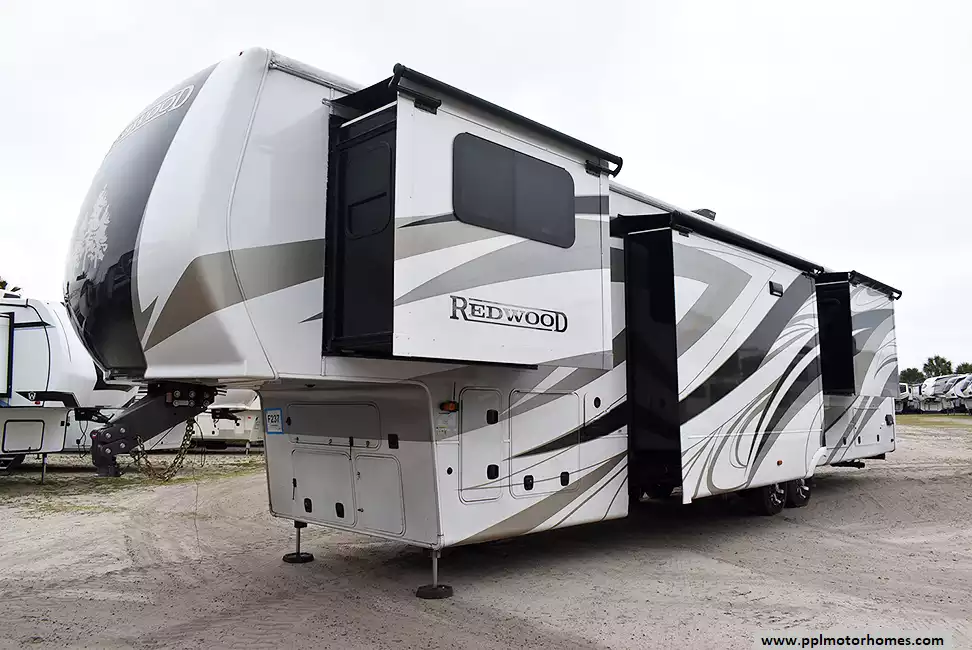 This 2024 Redwood 4200FL has a Hydraulic Landing Gear, 6 Slide-outs, Onan Propane Generator, 3 Ducted Air Conditioners, Samsung Refrigerator, In-Fridge Ice Maker, Automatic Main Awning And Slide Awning, Washer/Dryer, Dishwasher, Heated Tanks, Satellite Receiver, Outside Speakers, 2 TVs, Outside Shower, Fireplace, Central Vacuum, Microwave, 4 Burner Range, Oven