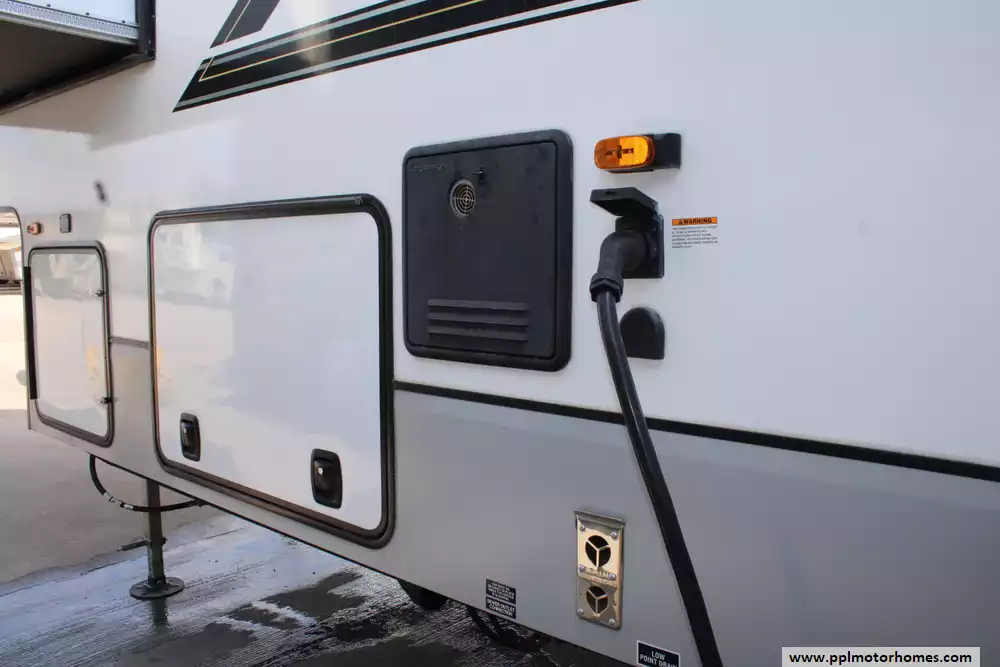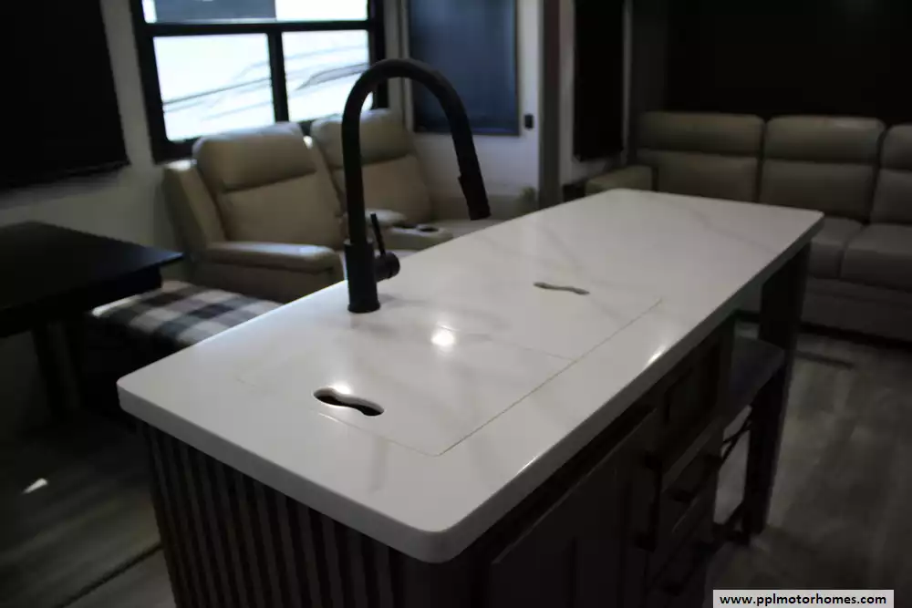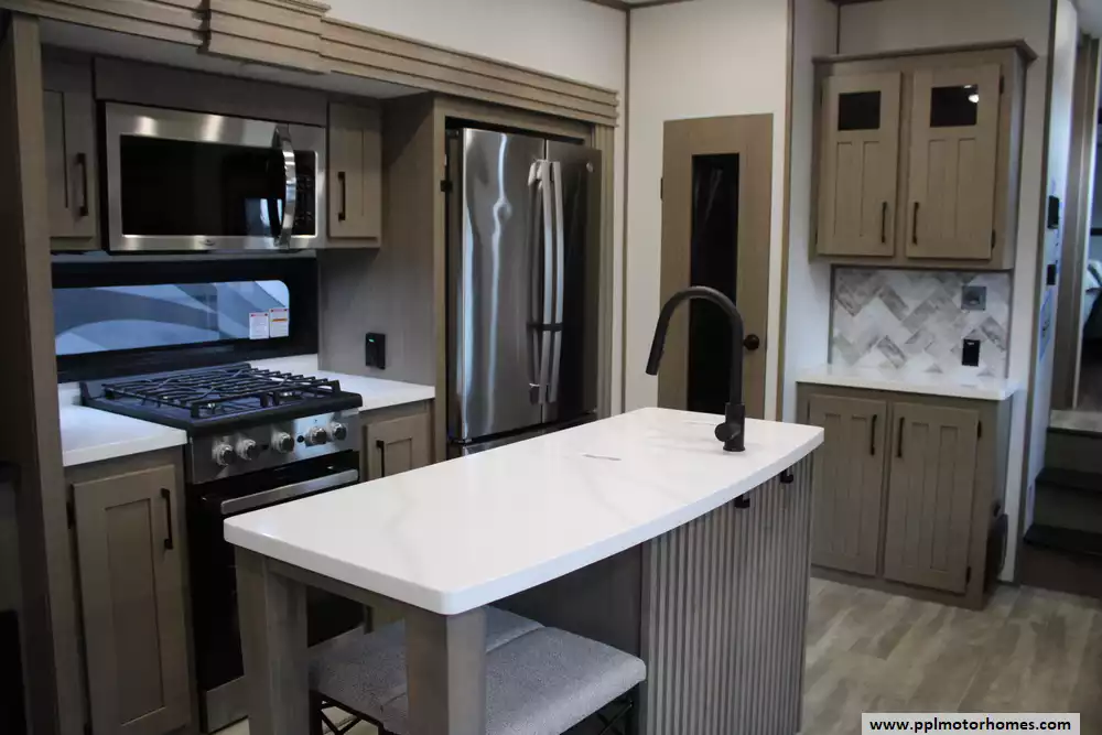 Built with aluminum framing, fiberglass exterior walls, and an enclosed, heated underbelly for all-season use, it also offers modern conveniences like a king-size bed, washer/dryer prep, tankless water heater, and a 76-gallon fresh water capacity. With high-end finishes, advanced climate control, and K-Z's reputation for durable construction, the 301RLT blends comfort, functionality, and quality for full-time or long-term RV living.