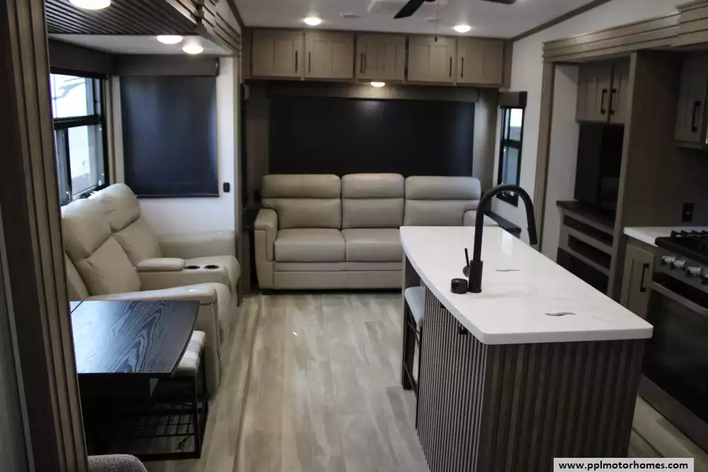 The 2024 K-Z Durango 301RLT is a mid-profile luxury fifth wheel designed for extended stays and residential-style comfort, measuring approximately 34 feet in length with a dry weight around 10,600 pounds, making it a solid option for experienced RVers with capable tow vehicles. It features a spacious rear living room layout with theater seating, a tri-fold sofa, entertainment center with fireplace, and large windows, while the central kitchen includes a residential island, solid-surface countertops, stainless steel appliances, and ample storage.
