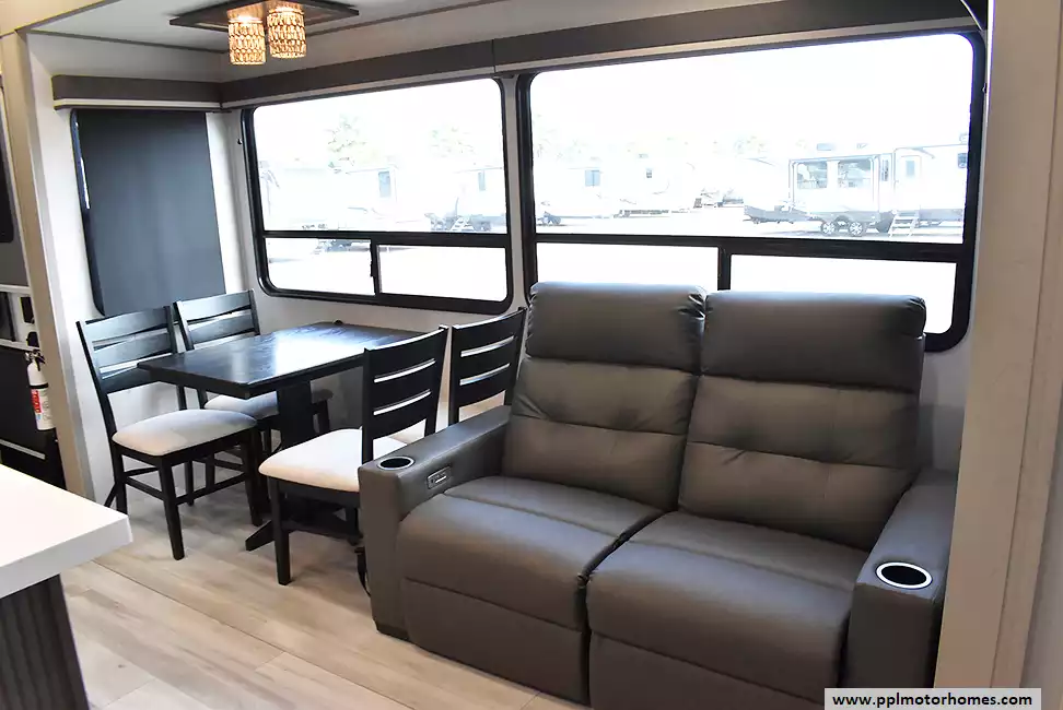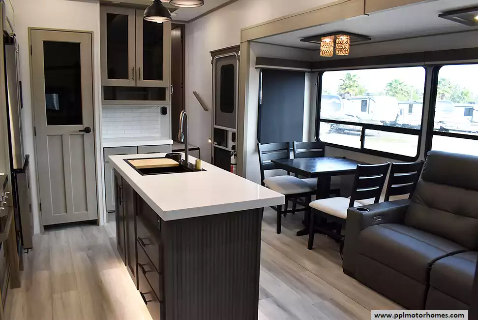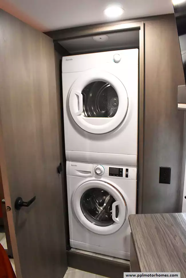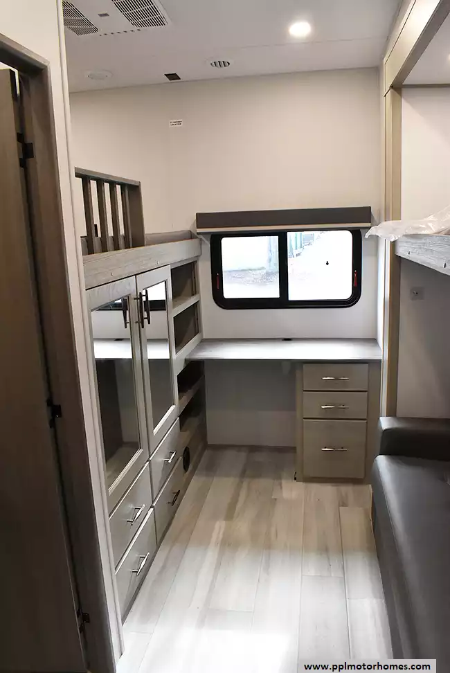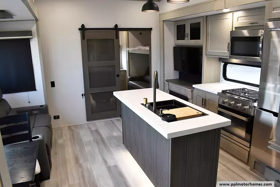 This unit is equipped with washer and dryer, slide toppers, and can be towed using either a gooseneck or standard fifth-wheel hitch, giving you maximum flexibility. The bunkhouse provides dedicated sleeping and storage space, while the main living area offers residential finishes and plenty of room to relax.