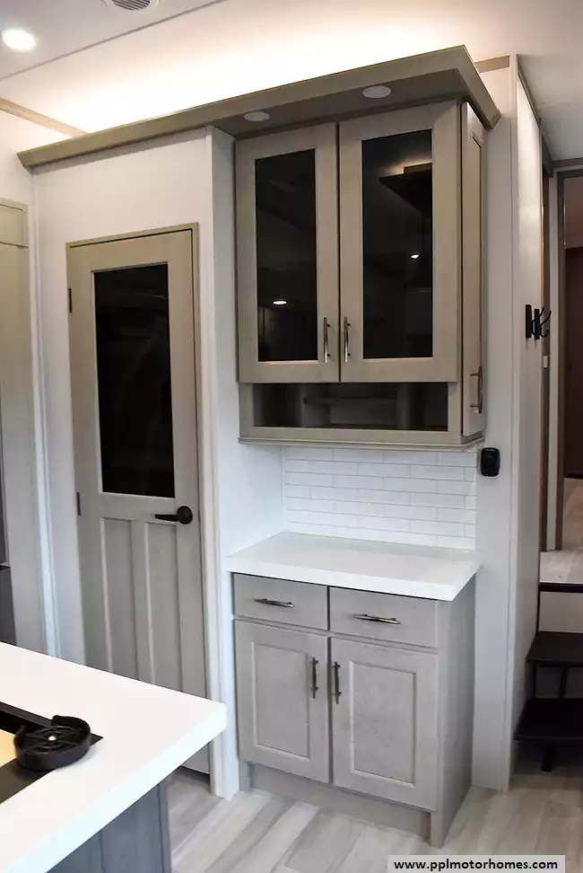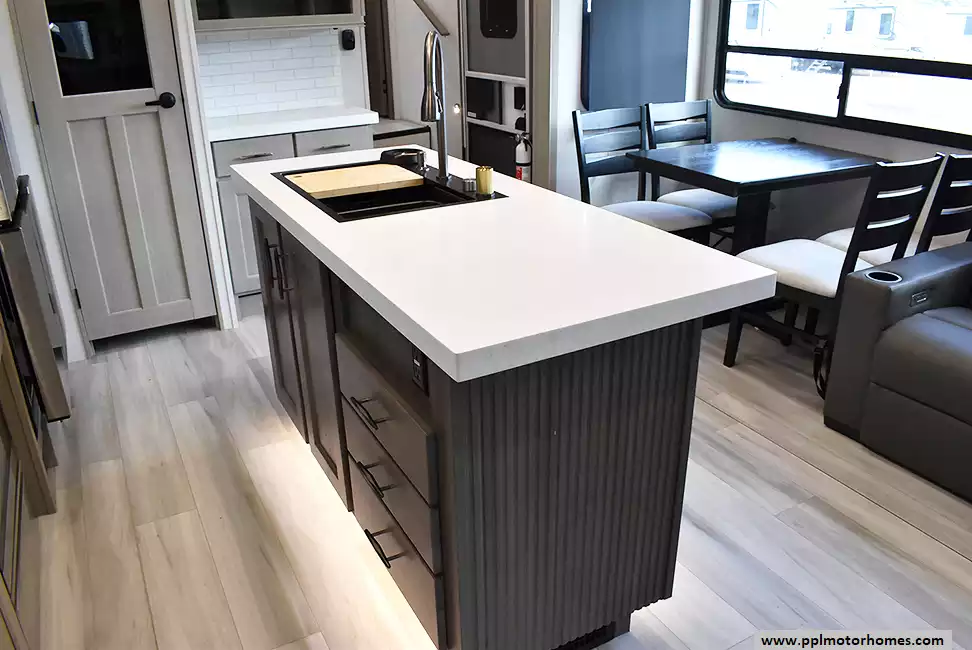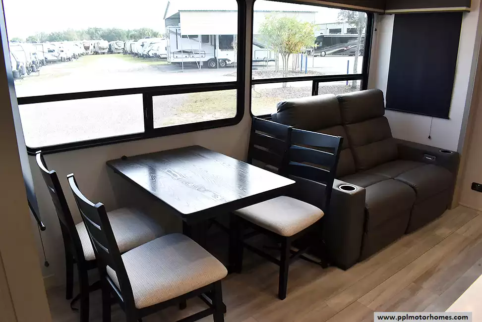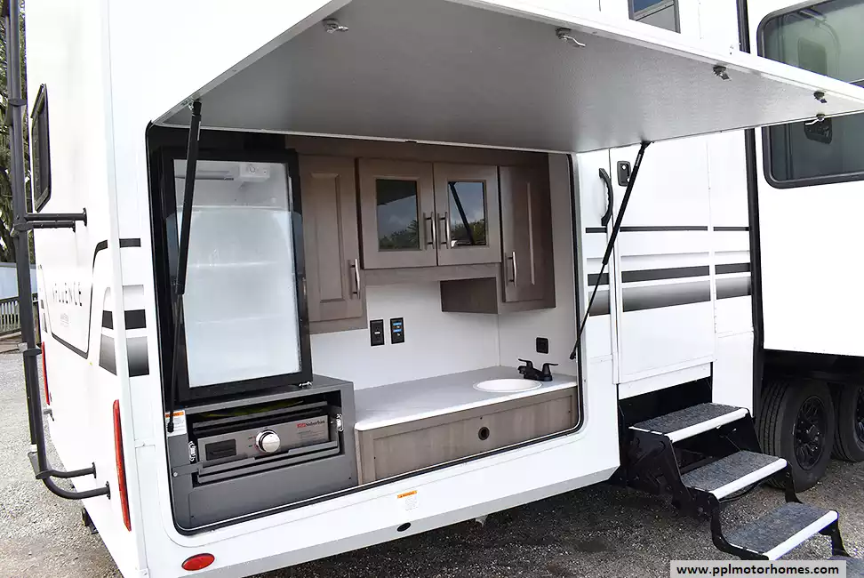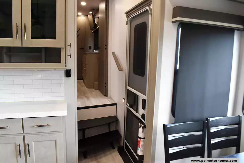 This unit is equipped with washer and dryer, slide toppers, and can be towed using either a gooseneck or standard fifth-wheel hitch, giving you maximum flexibility. The bunkhouse provides dedicated sleeping and storage space, while the main living area offers residential finishes and plenty of room to relax.
