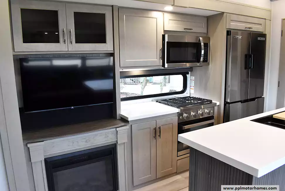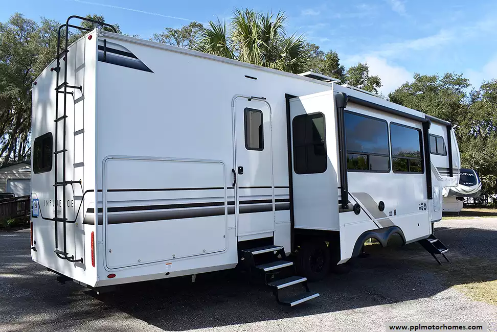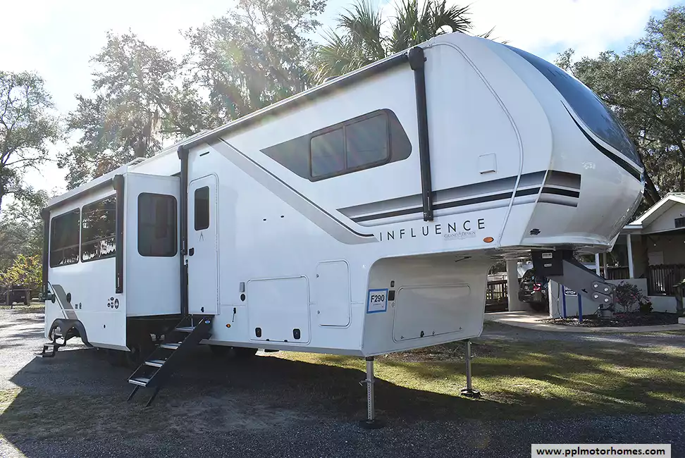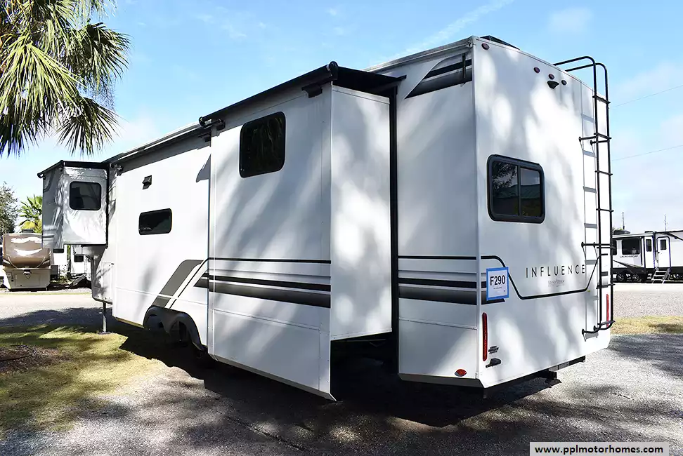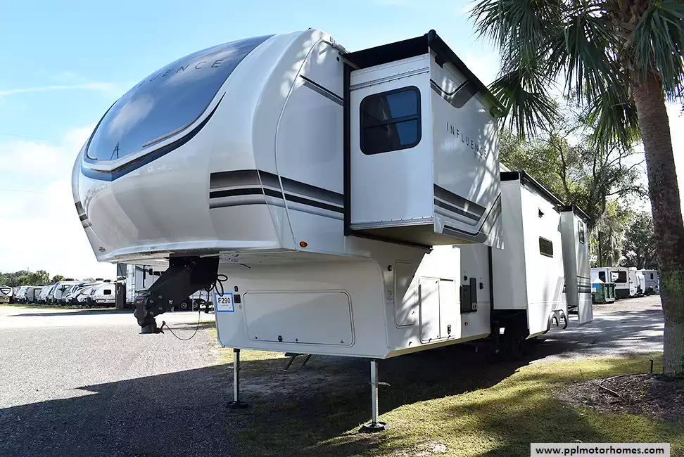 This 2025 Influence 3740BH has a 2 Slide-outs, 3 Ducted Air Conditioners, 110v/12v Norcold Refrigerator, Automatic Main Awning And Slide Awning, Washer/Dryer, Solar Panel, Satellite Receiver, Outside Speakers, 2 TVs, Outside Shower, Fireplace, Microwave, 3 Burner Range, Oven
