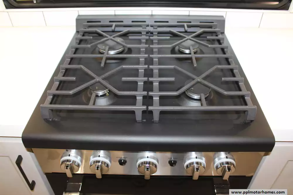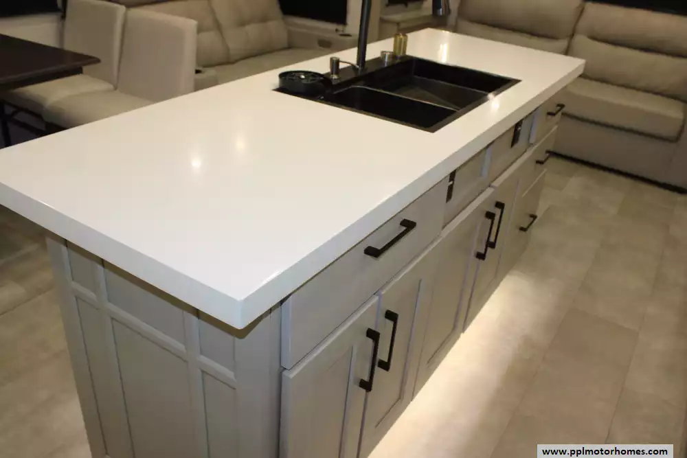 Specs: Length: 34.4 ft., Height: 13.5 ft., Width: 8.5 ft., Interior Height: 8.08 ft, Total Fresh Water Tank Capacity: 83 gal., Total Gray Water Tank Capacity: 106 gal., Total Black Water Tank Capacity: 53 gal., Total Propane Tanks: 2, Total Propane Tank Capacity: 60 lbs.