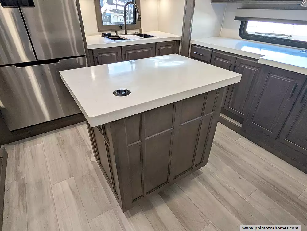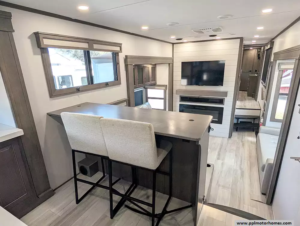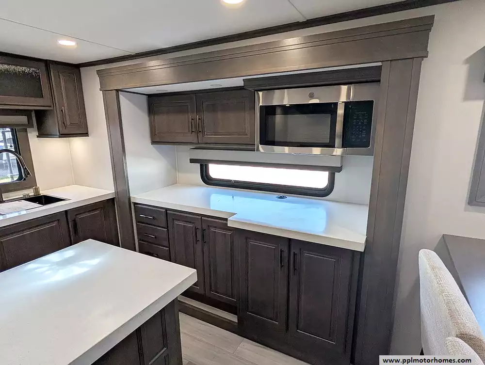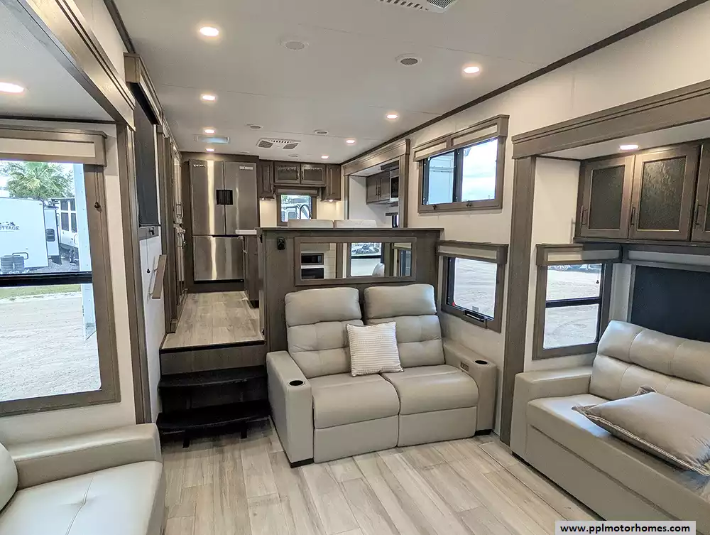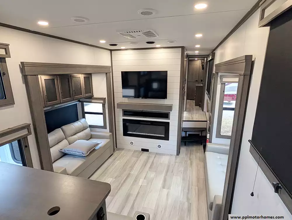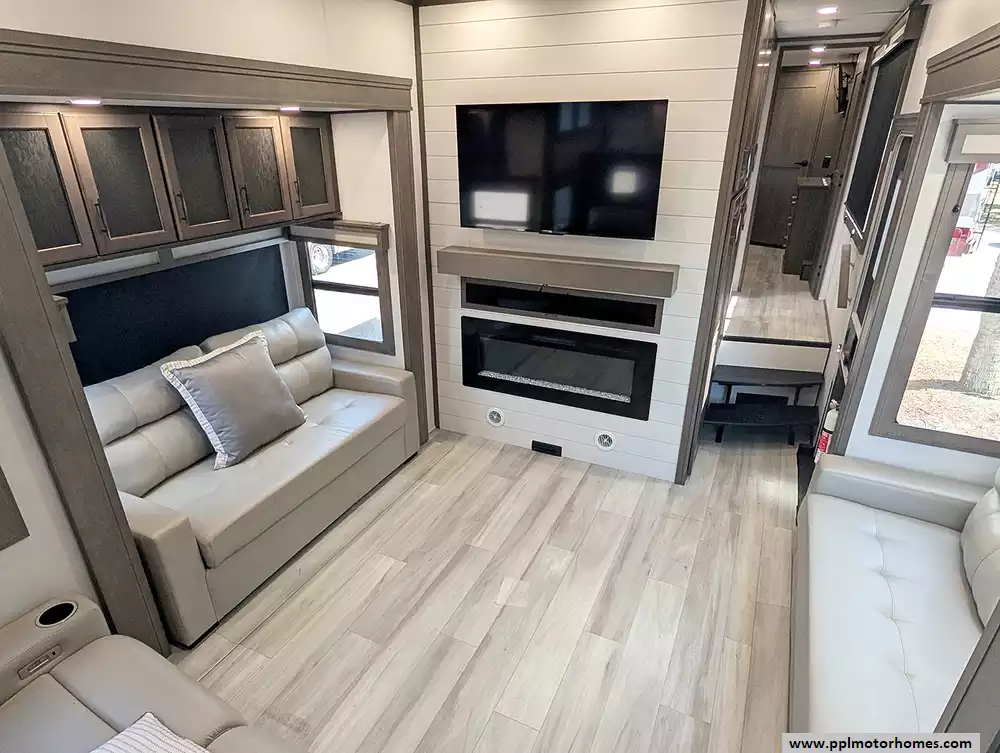 Experience the pinnacle of luxury extended-stay travel with the 2025 Grand Design Solitude 390RK. Renowned for its residential-style living and industry-leading construction, this five-slide fifth wheel features an innovative elevated rear kitchen that offers incredible counter space and a sophisticated footprint perfect for entertaining. Built with a durable fiberglass exterior and a rubber roof, this unit is engineered for the long haul. The interior provides a true home-away-from-home atmosphere, featuring a central vacuum system, a cozy fireplace, and a gourmet kitchen equipped with a four-burner range, oven, microwave, and a spacious residential Norcold refrigerator.