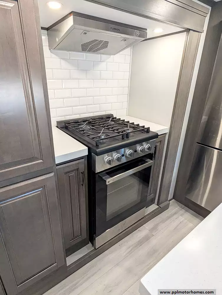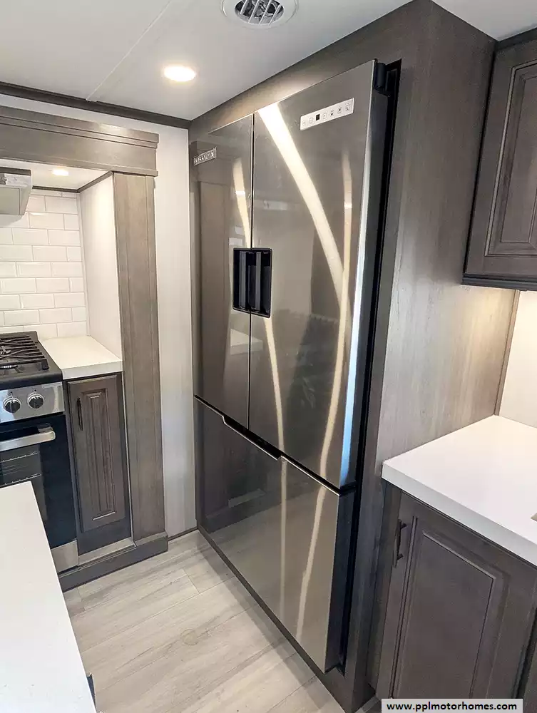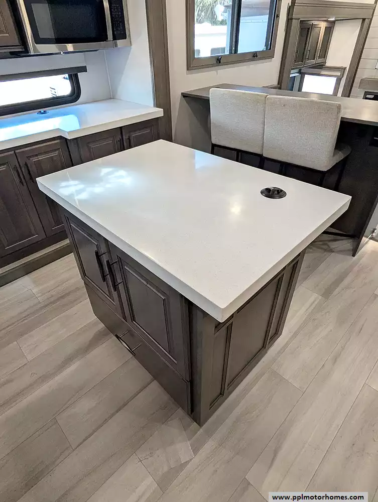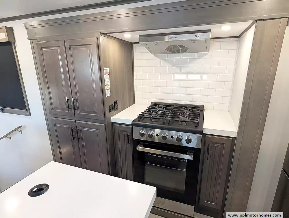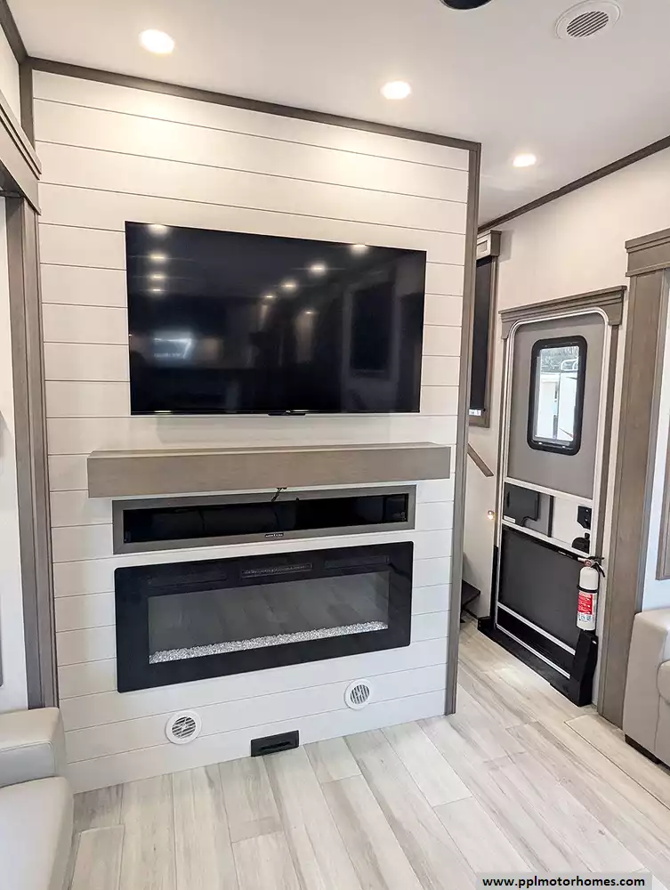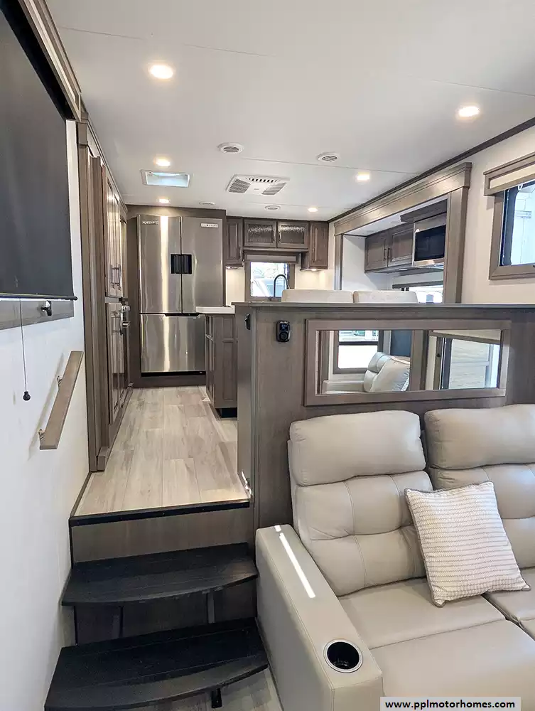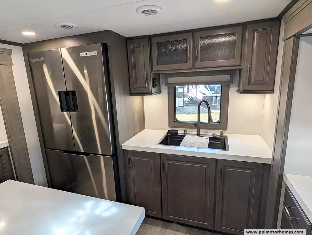 Experience the pinnacle of luxury extended-stay travel with the 2025 Grand Design Solitude 390RK. Renowned for its residential-style living and industry-leading construction, this five-slide fifth wheel features an innovative elevated rear kitchen that offers incredible counter space and a sophisticated footprint perfect for entertaining. Built with a durable fiberglass exterior and a rubber roof, this unit is engineered for the long haul. The interior provides a true home-away-from-home atmosphere, featuring a central vacuum system, a cozy fireplace, and a gourmet kitchen equipped with a four-burner range, oven, microwave, and a spacious residential Norcold refrigerator.