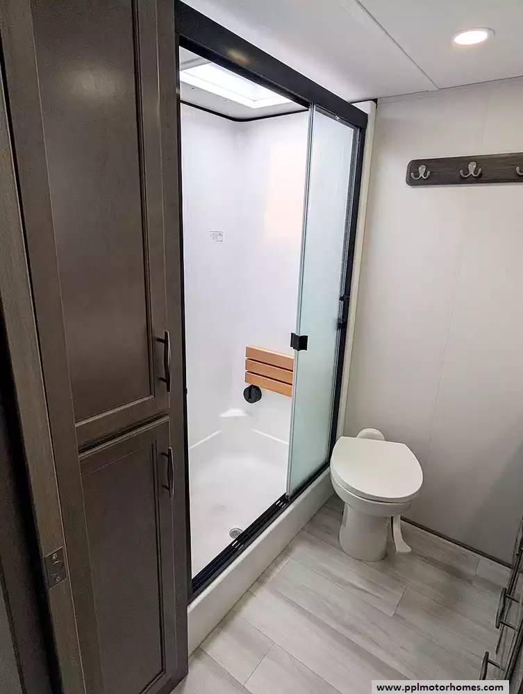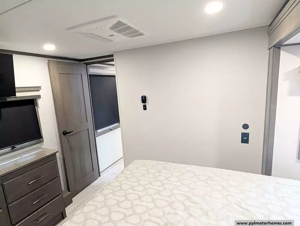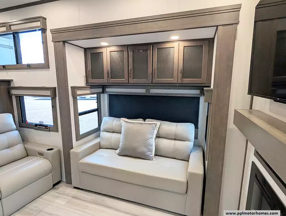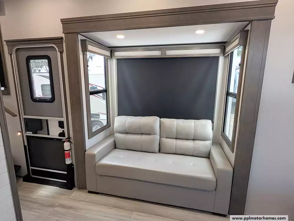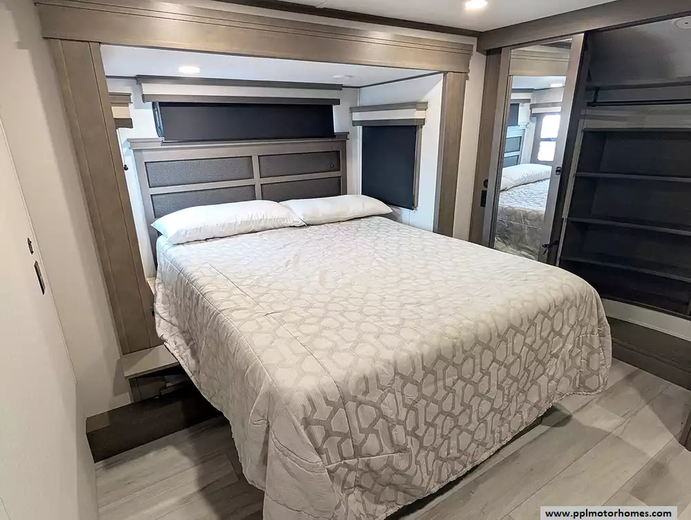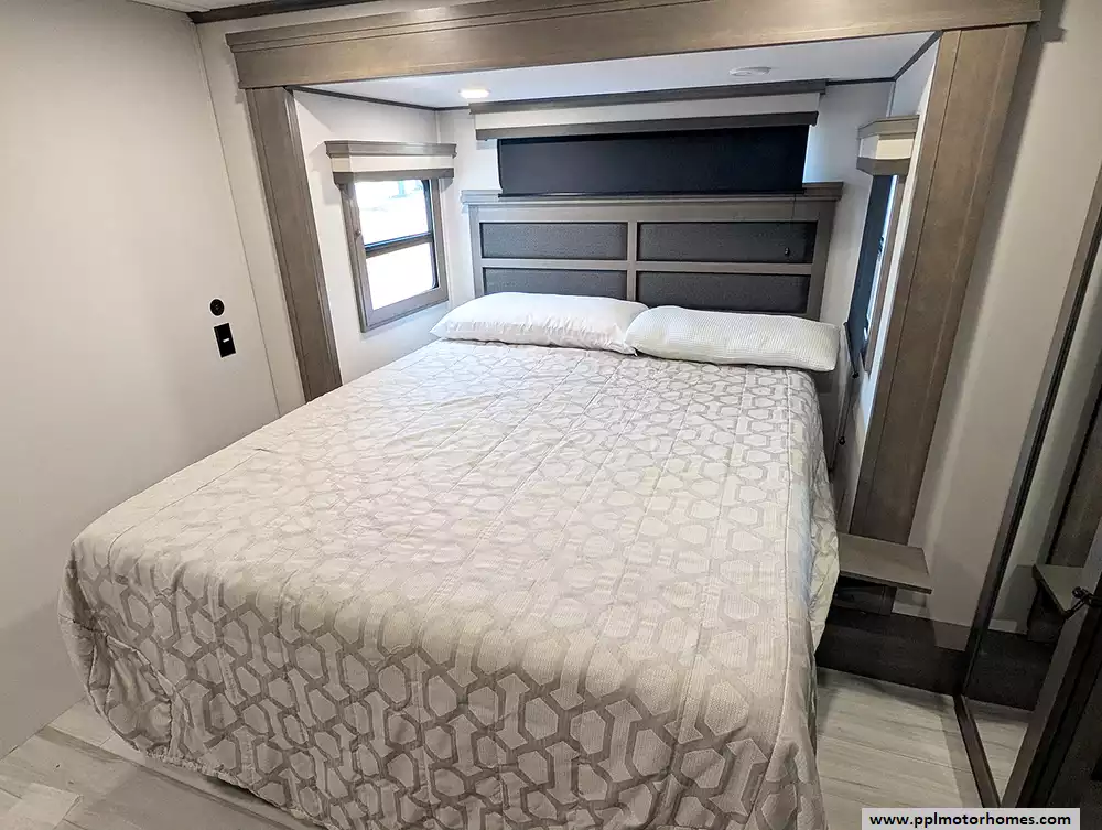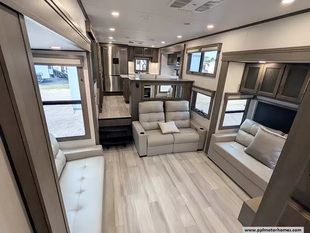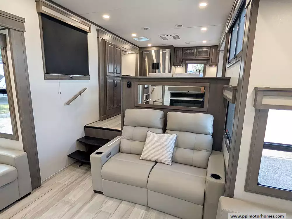 This Solitude is fully outfitted for premium comfort and off-grid versatility, featuring an Onan propane generator and a rooftop solar panel system. The climate-controlled interior stays perfect in any weather thanks to three ducted air conditioners and heated tanks for four-season protection. Outside, you will find automatic main and slide awnings, exterior speakers, and a convenient outside shower. With washer and dryer connections, two televisions, and a satellite receiver already included, this 42-foot masterpiece is ready to provide a seamless, high-end lifestyle wherever your journey takes you.