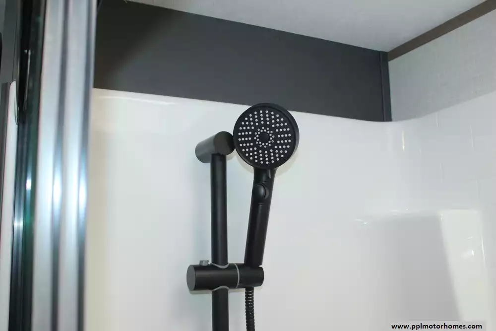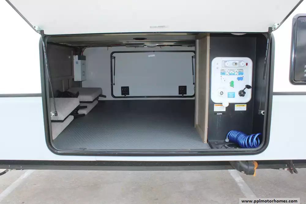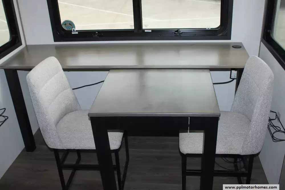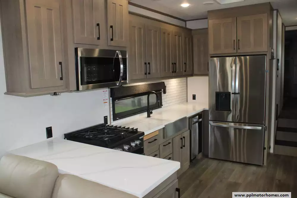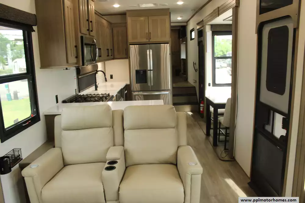 Specs: Length: 42.11 ft., Width: 8.42 ft., Height: 13.6 ft., Payload Capacity: 2,210 lbs., Total Fresh Water Tank Capacity: 76 gal., Total Grey Tank Capacity: 90 gal., Total Black Water Tank Capacity: 50 gal., Propane Tank Capacity: 60 lbs.