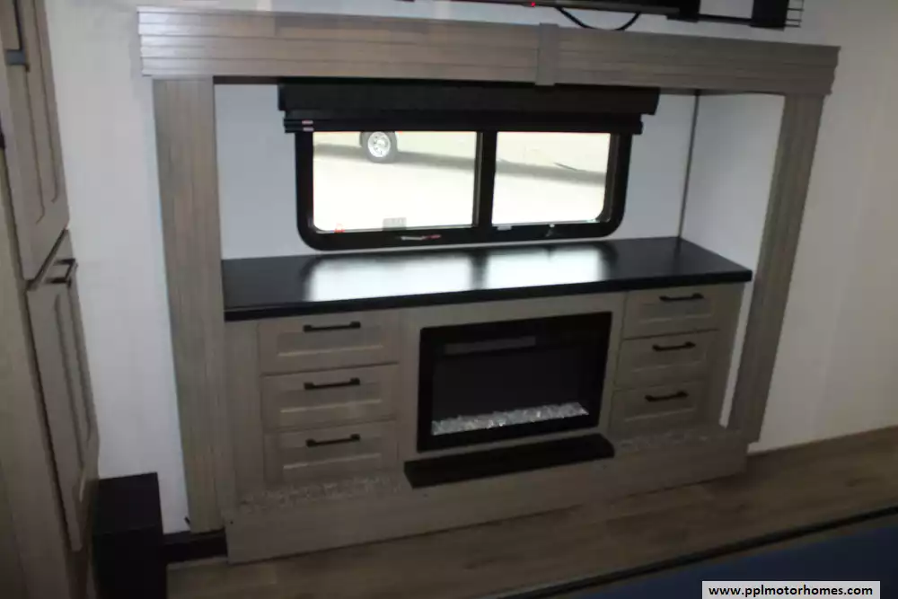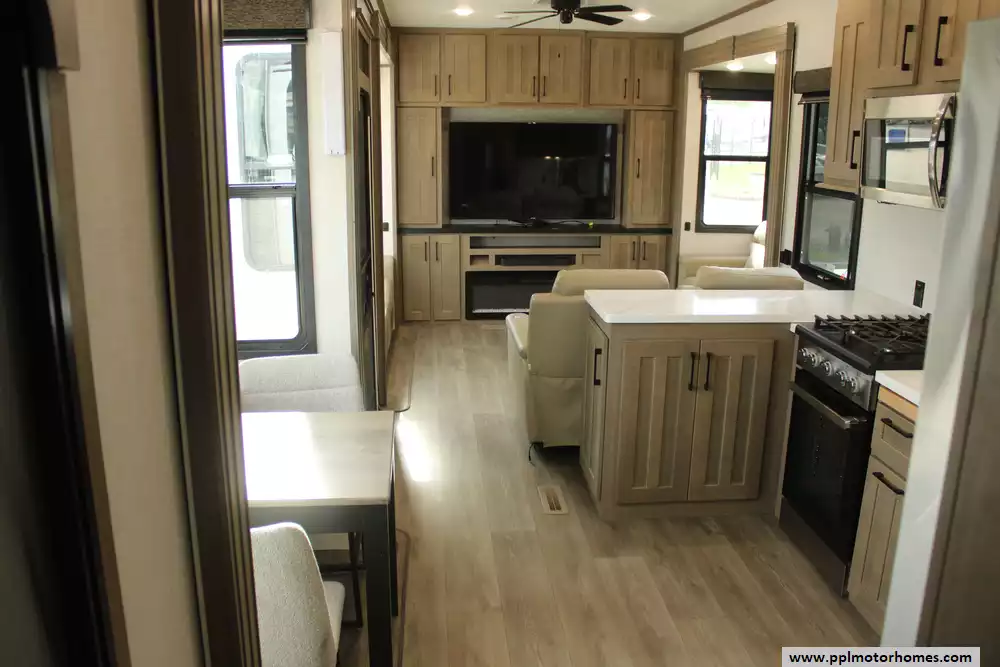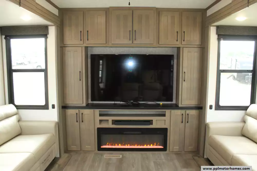 Experience a new standard of luxury and space with the 2025 Durango Half-Ton 393MKF, a 42-foot fifth wheel designed for those who want a residential feel without the heavy-duty tow vehicle requirements. Known for its industry-leading front-kitchen layout, this model maximizes every inch of its fiberglass exterior and rubber roof construction with an incredible five slide-outs that create an expansive, open-concept living area. The interior is kept perfectly comfortable in any climate thanks to three ducted air conditioners, while the integrated fireplace provides a cozy focal point for the main living space. Whether you are hosting friends or enjoying a quiet night in, the two televisions and premium outside speakers ensure you have the ultimate entertainment setup both inside and out.