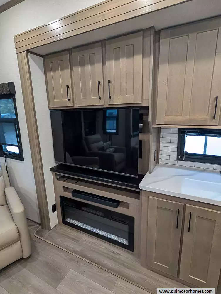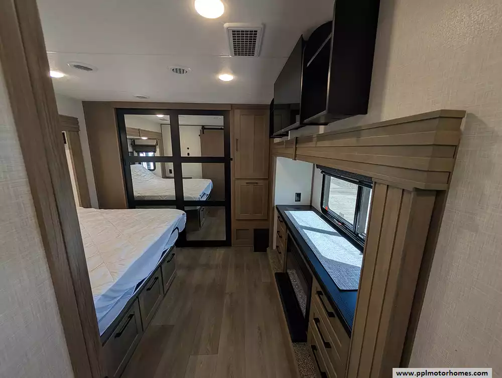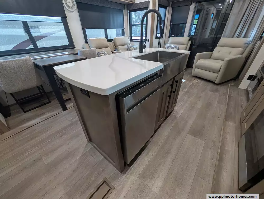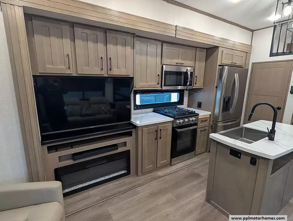Inside, the residential-style kitchen is a chef's dream, boasting a four-burner range, oven, microwave, and a high-capacity LG refrigerator with a convenient in-fridge ice maker. Luxury meets utility with the addition of a built-in dishwasher, central vacuum system, and a washer/dryer unit to make long-term stays feel like a permanent vacation. You will stay perfectly climate-controlled with three ducted air conditioners and a cozy interior fireplace, while the dual TVs and satellite receiver provide premium entertainment options. From its expansive living areas to its modern residential appointments, the 2025 Durango Gold 382MBF is engineered for those who refuse to compromise on the quality of their travel experience.