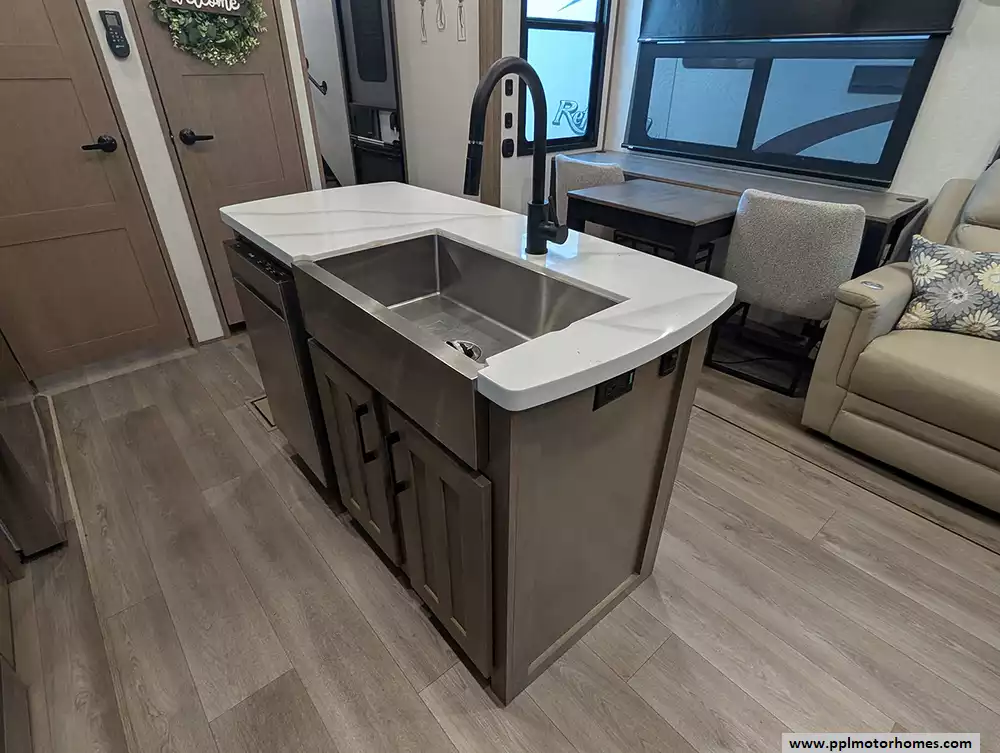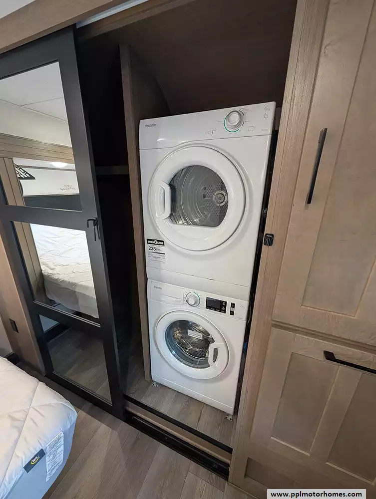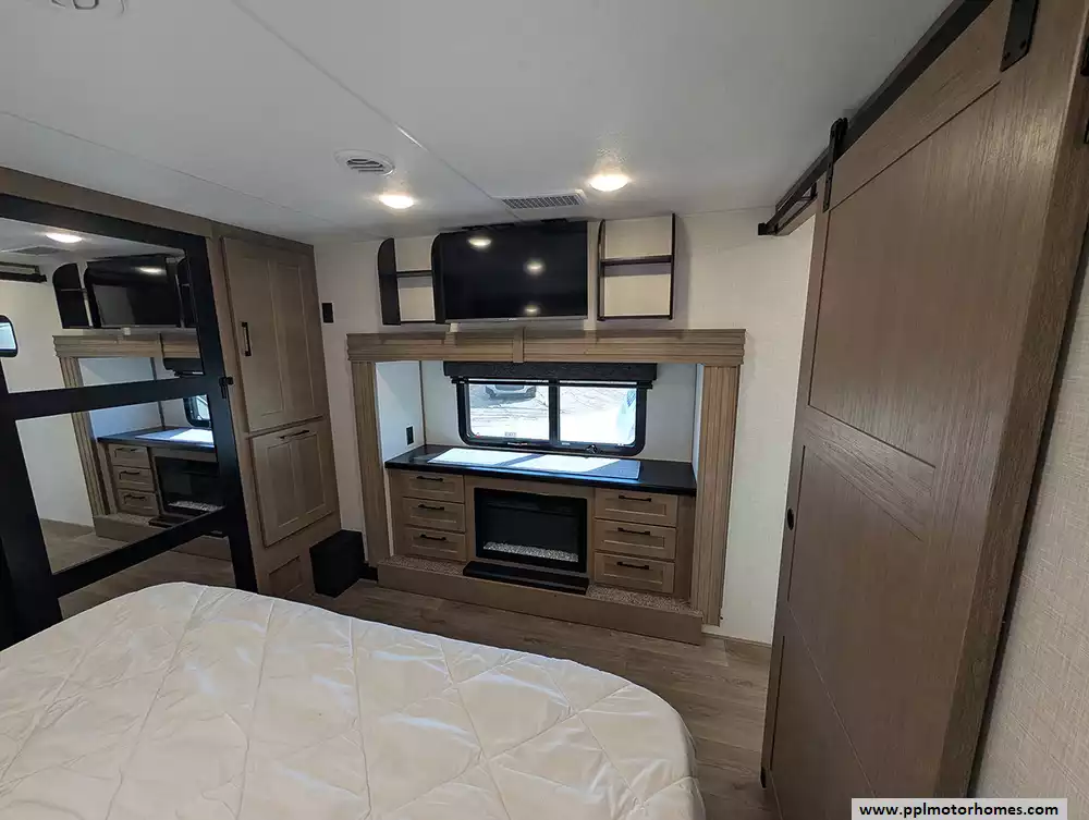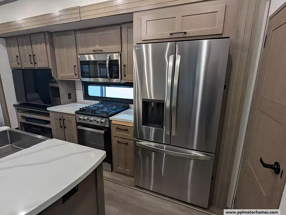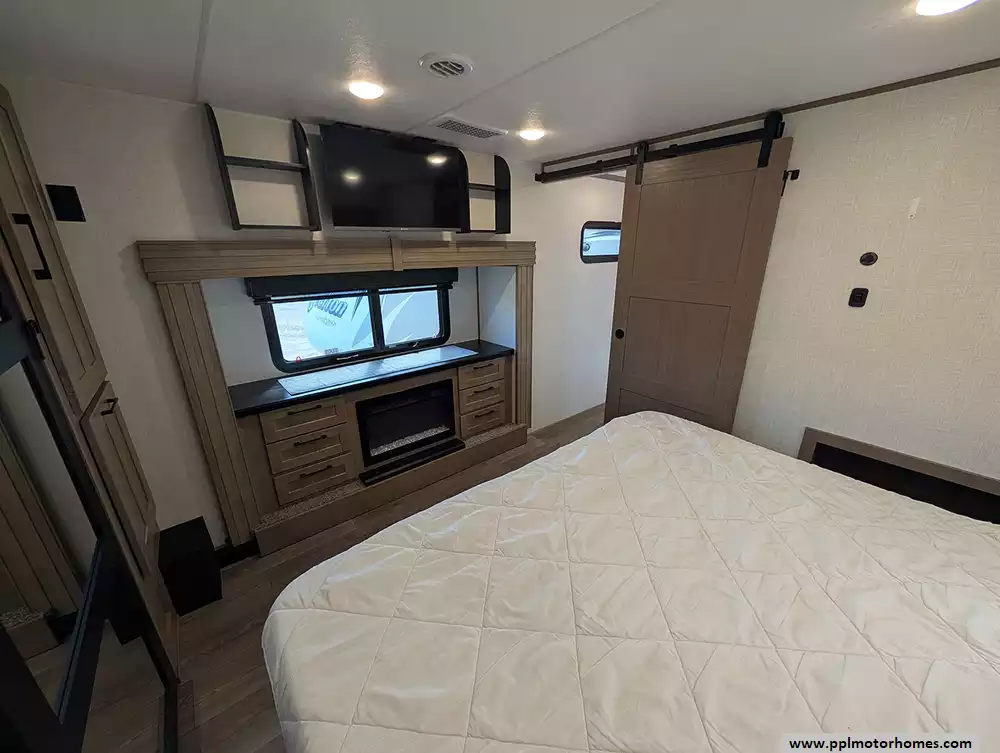 Inside, the residential-style kitchen is a chef's dream, boasting a four-burner range, oven, microwave, and a high-capacity LG refrigerator with a convenient in-fridge ice maker. Luxury meets utility with the addition of a built-in dishwasher, central vacuum system, and a washer/dryer unit to make long-term stays feel like a permanent vacation. You will stay perfectly climate-controlled with three ducted air conditioners and a cozy interior fireplace, while the dual TVs and satellite receiver provide premium entertainment options. From its expansive living areas to its modern residential appointments, the 2025 Durango Gold 382MBF is engineered for those who refuse to compromise on the quality of their travel experience.