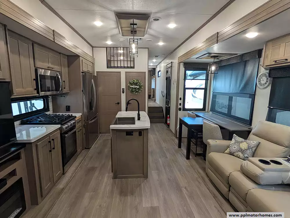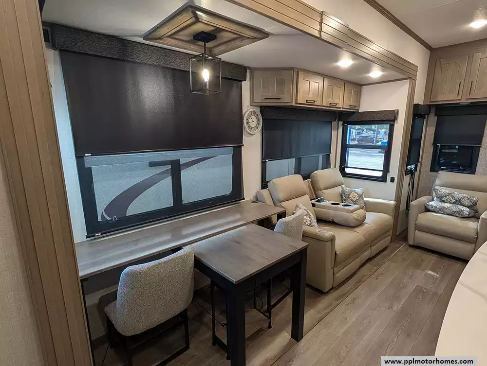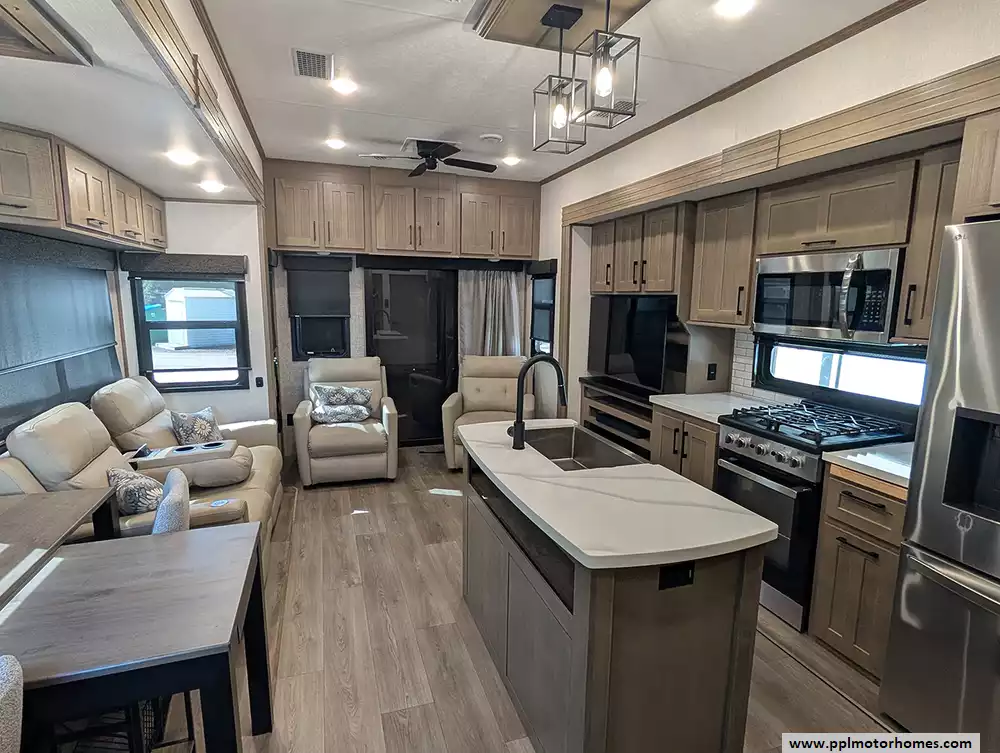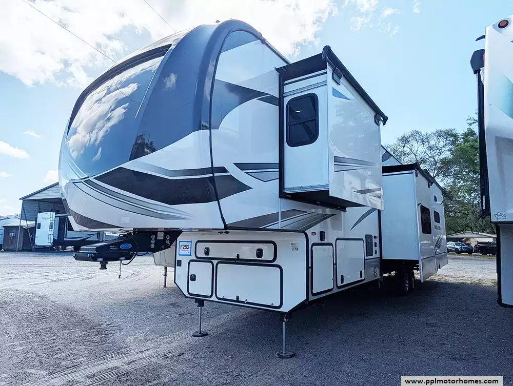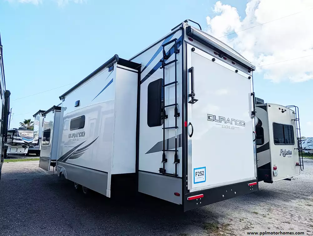 The 2025 Durango Gold 382MBF represents the absolute peak of luxury fifth-wheel living, offering a massive 42-foot floorplan built with a high-gloss fiberglass exterior and a durable rubber roof. Renowned as the gold standard for full-time RVers, this model features an incredible five slide-outs that transform the interior into a sprawling residential suite, complemented by the brand's reputation for superior craftsmanship and all-weather durability. Setting up your home on the road is effortless with the heavy-duty hydraulic landing gear and automatic main awning, while the integrated solar panel and outside shower provide the perfect balance of rugged independence and high-end comfort.