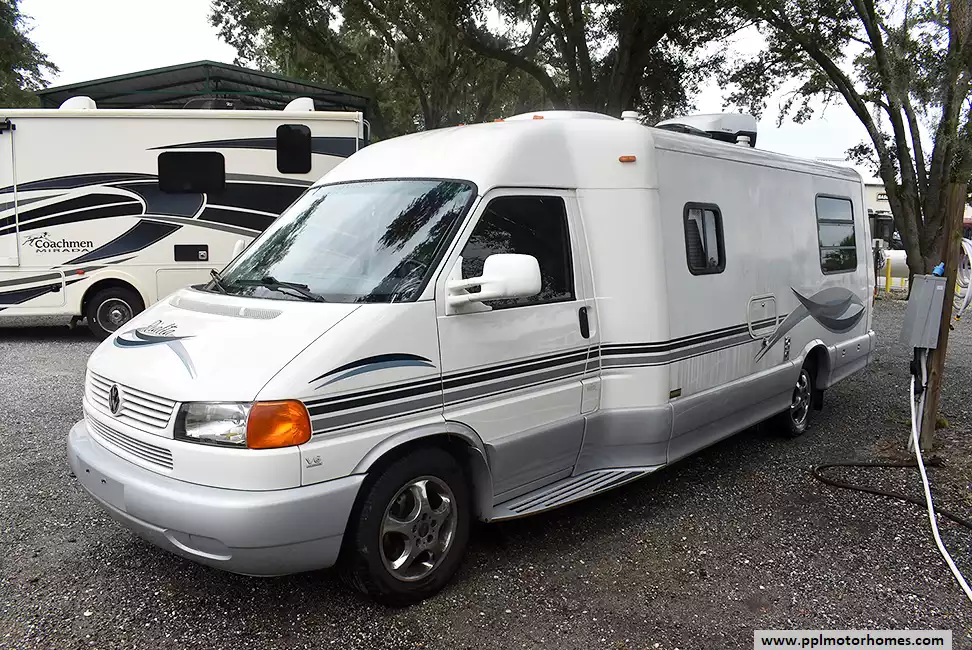 This 2003 Winnebago Rialta 22 HD has a V6 Volkswagen Engine On a Volkswagon Chassis, Onan Gas Generator, 1 Ducted Air Conditioner, Single Door Gas/12v Norcold Refrigerator, Outside Shower, Microwave, 3 Burner Range, Oven