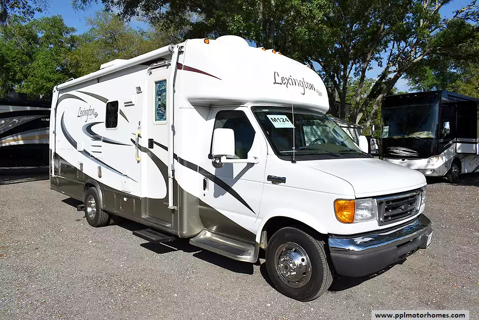 This 2006 Lexington by Forest River 255D has a Ford Engine On a Ford 450 Chassis, 2 Slide-outs, Onan Gas Generator, 1 Ducted Air Conditioner, Double Door Gas/110v Dometic Refrigerator, Main/Window/Slide Awnings, Backup Camera, Outside Speakers, 2 TVs, Outside Shower, Convection Microwave, 3 Burner Range
