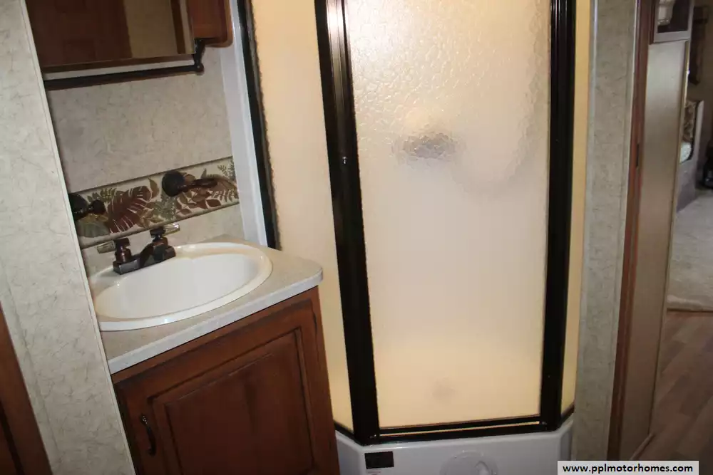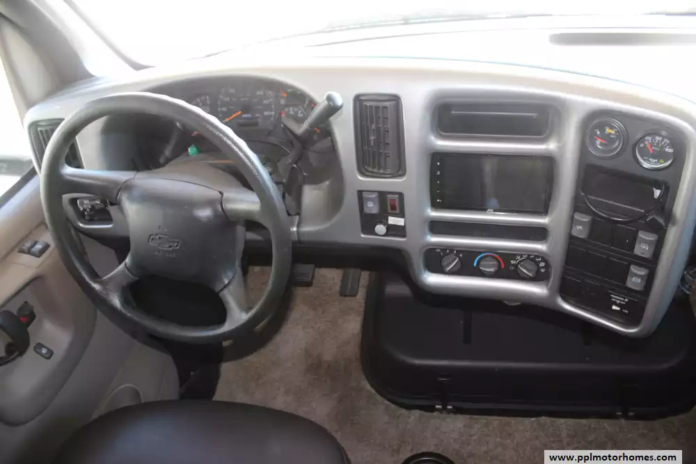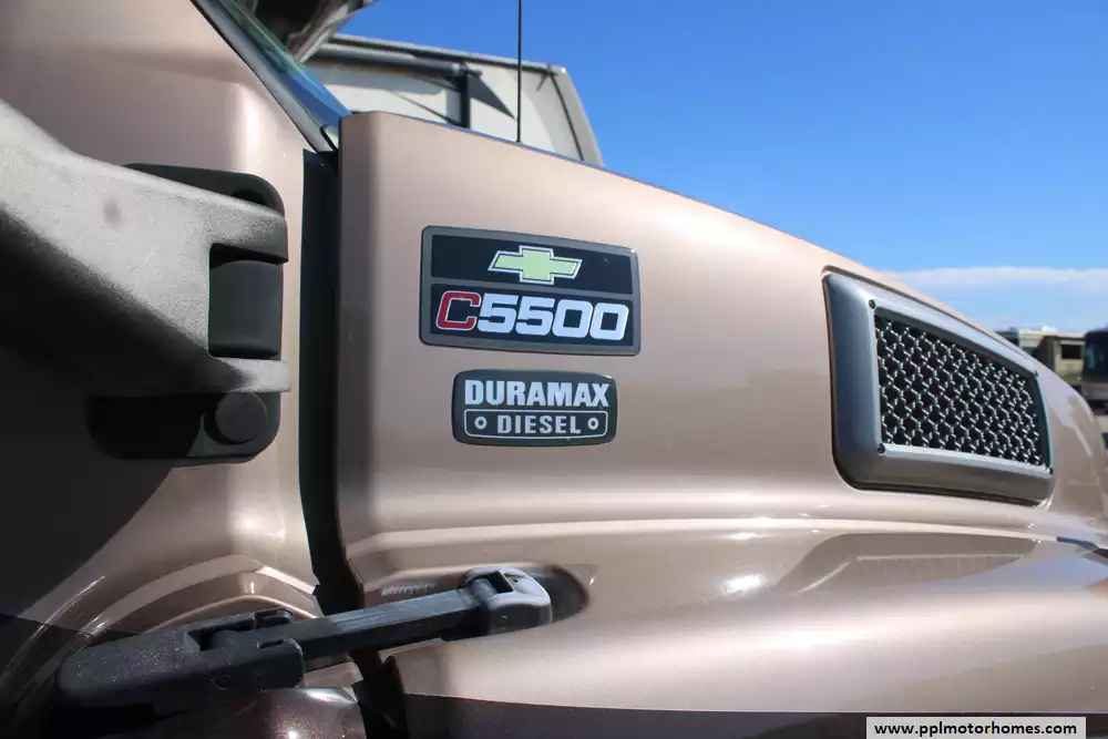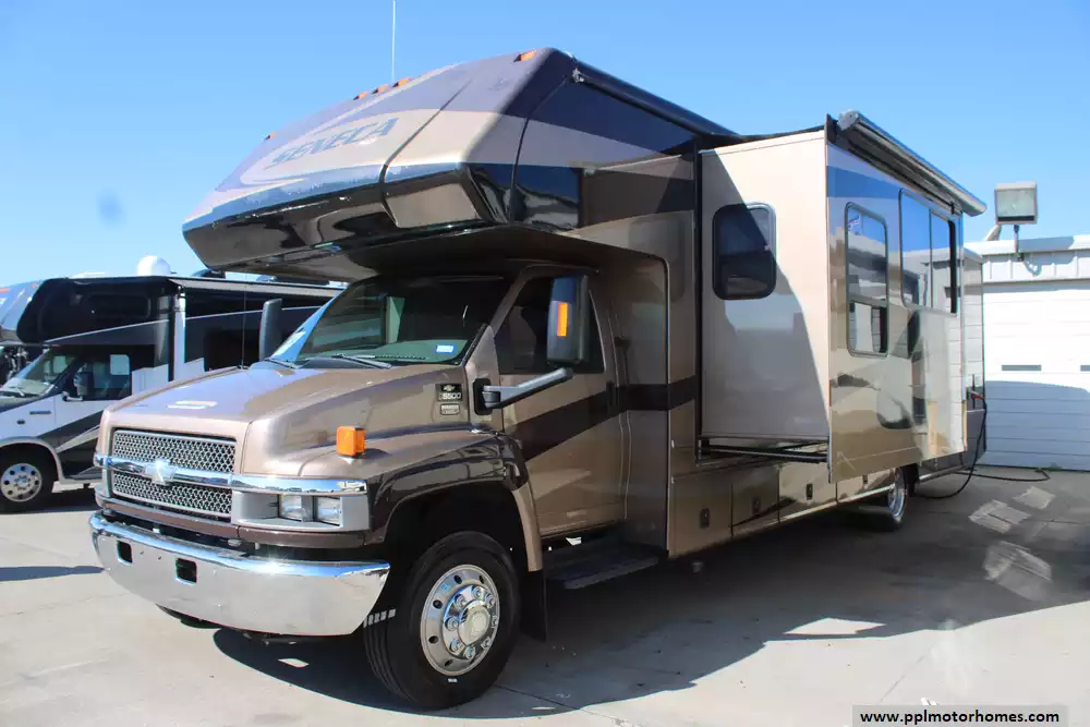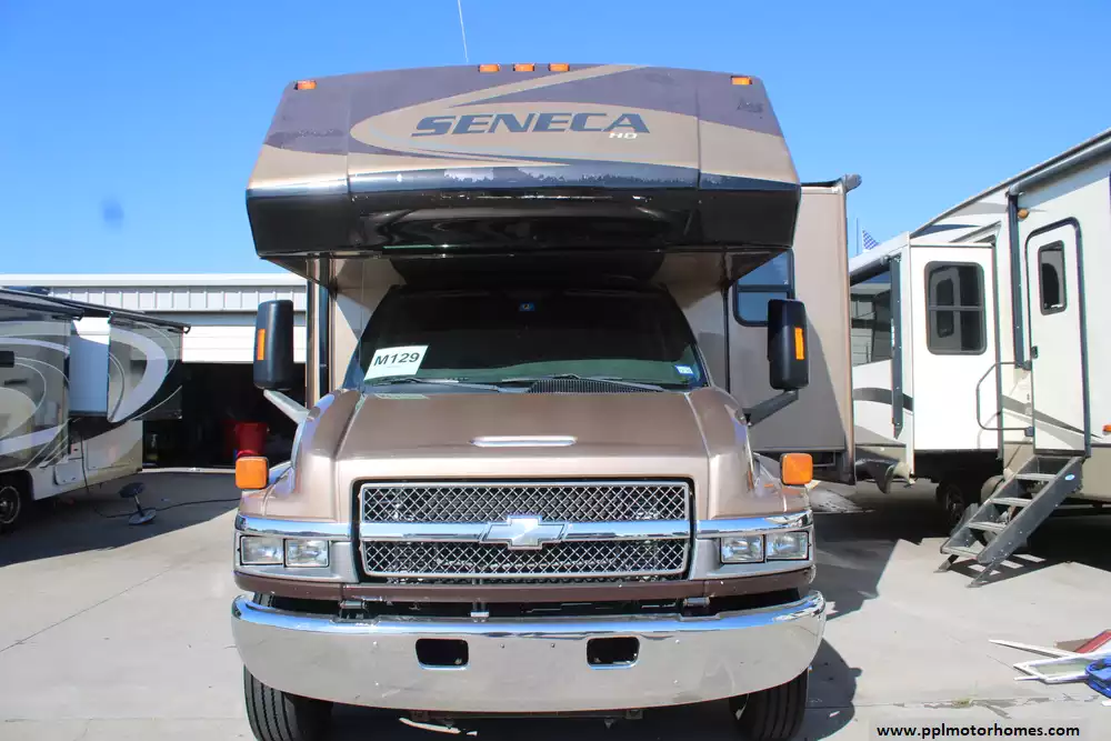 The 2006 Jayco Seneca HD 35GS is a Super-C diesel motorhome built on a Chevy C5500/Kodiak chassis, powered by a 6.6L Duramax V8 producing about 300 hp with an Allison 5-speed automatic transmission. At roughly 36-feet long with three slide-outs, it provides generous living space including a queen bed, booth or free-standing dinette, sofa/hide-a-bed, overhead entertainment center, and full bath with neo-angle shower. Tank capacities are also roomy: about 65 gallons of fresh water, 41 gallons grey water, 52 gallons black water, with a 22,000 lb GVWR. It also includes features such as a quiet diesel generator (Onan), dual-A/C units (rear A/C replaced about 6 months ago), re-upholstered captains chairs, plenty of cabinetry and storage, power and convenience upgrades (like power awning, leveling jacks, backup camera options), making it well-suited both for long road trips and full-time use.