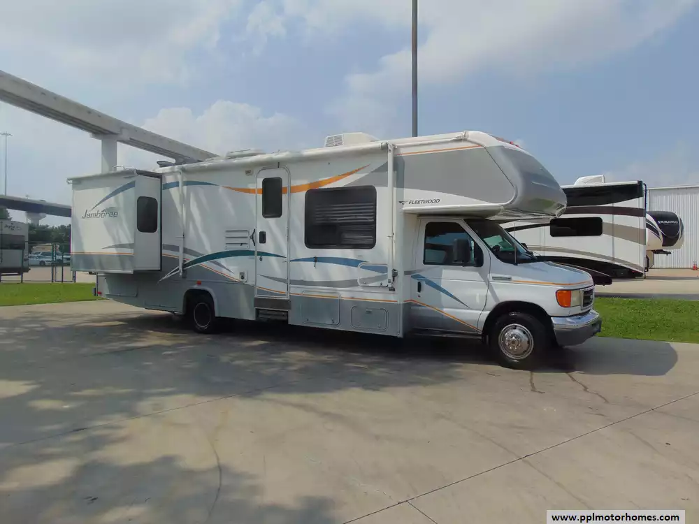 This 2007 Jamboree by Fleetwood 31K is known for its comfortable layout and practical amenities. Comforts Include...V10 6.8l Ford Engine On a Ford 450 Chassis, 2 Slide-outs, Onan Gas Generator, 1 Ducted Air Conditioner, Levelers, Double Door Gas/110v Dometic Refrigerator, Main/Slide Awnings, Backup Camera, Heated Tanks, TV, Satellite Radio, Outside Shower, Microwave, and 2 Burner Range. Its versatile layout and amenities make it a popular choice among RV enthusiasts looking for a well-rounded motorhome.