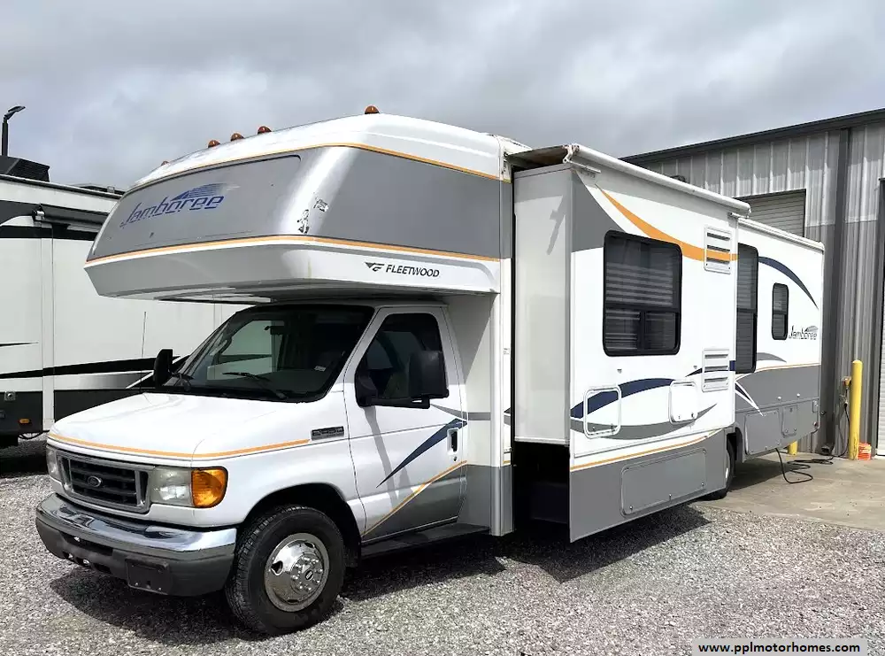 This 2008 Jamboree by Fleetwood 31M has a V10 Ford Engine On a Ford 450 Chassis, 2 Slide-outs, Onan Gas Generator, 1 Ducted Air Conditioner, Double Door Gas Dometic Refrigerator, Automatic Main Awning And Window/Door Awnings, Outside Speakers, 2 TVs, DVD Player, Outside Shower, Microwave, 3 Burner Range, Oven