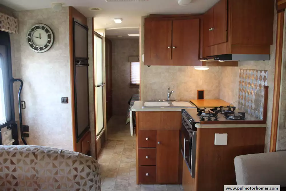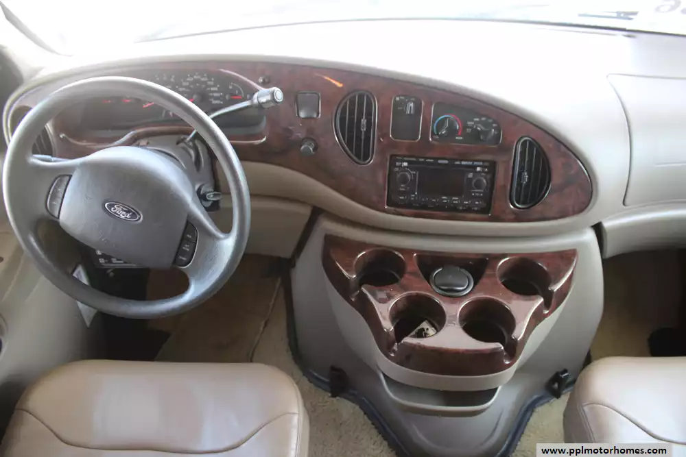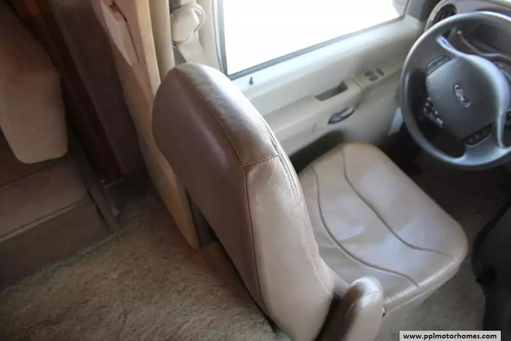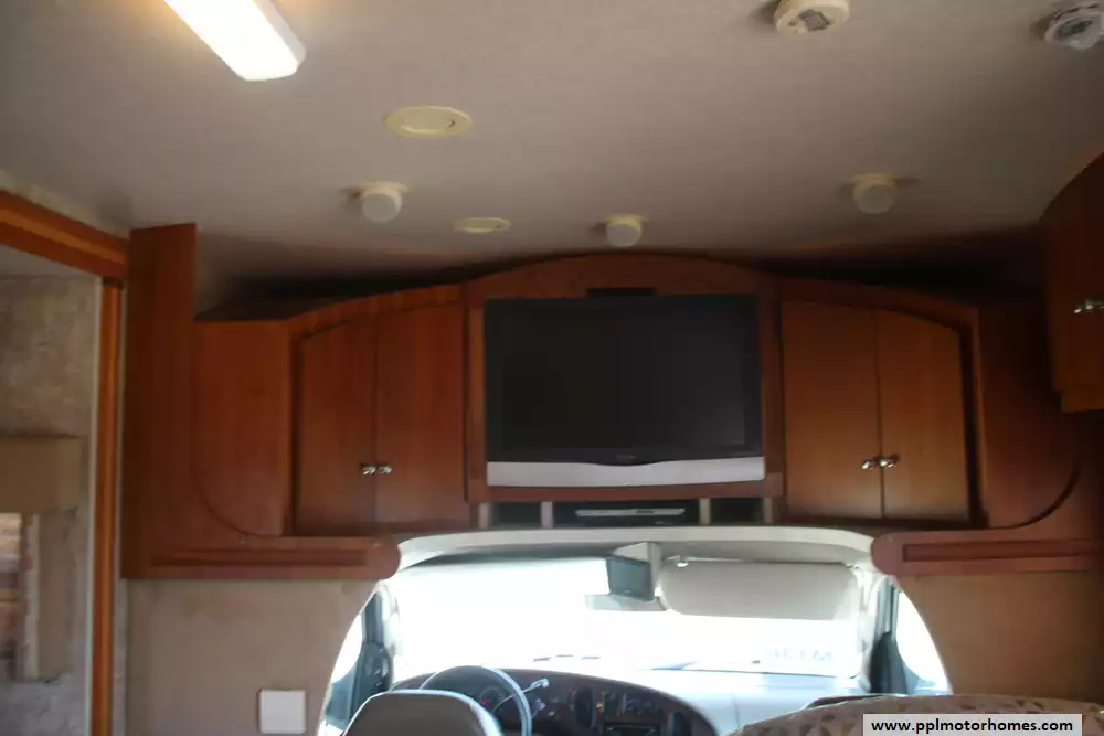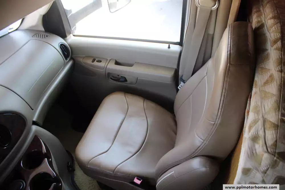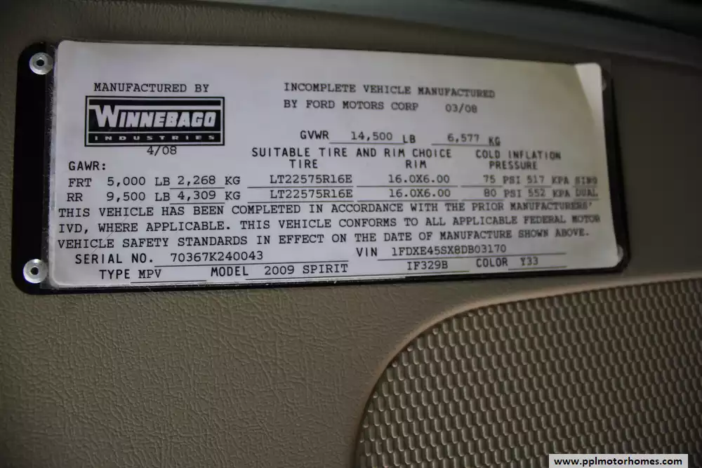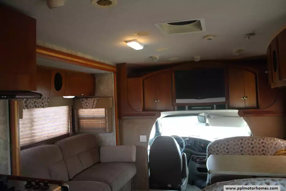 The 2009 Itasca Spirit 29B is built on a Ford E-450 chassis powered by a 6.8L Triton V10 engine delivering 305 horsepower, paired with a 5-speed TorqShift automatic transmission with overdrive, offering both robust performance and respectable tow capability of up to 5,000 lbs. Stretching at an overall length of over 30 feet long, this model comfortably sleeps up to six passengers across its queen bedroom and multiple convertible seating areas, thanks to two power slideouts that expand the living space on demand. This model features an overhead entertainment center instead of the standard overhead cab bunk. Standard amenities include a mid-size electric/propane refrigerator, a three-burner range with oven, microwave, full kitchen, and a central bathroom with a separate shower/shower curtain layout. It supports extended adventures with sizable onboard capacities: 55-gallon fuel, 42-gallon fresh water, 39-gallon gray, and 30-gallon black water tanks, plus a long 14-foot awning to bring the outdoors in. This Spirit also features full body paint, fiberglass roof, surround sound speakers, and a flip-up countertop extension.
