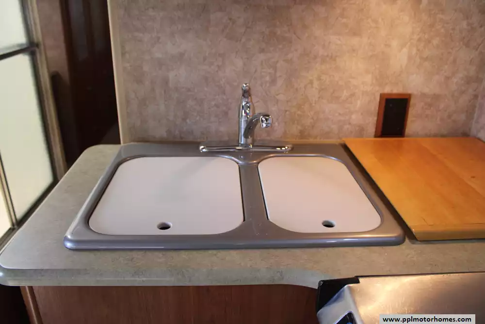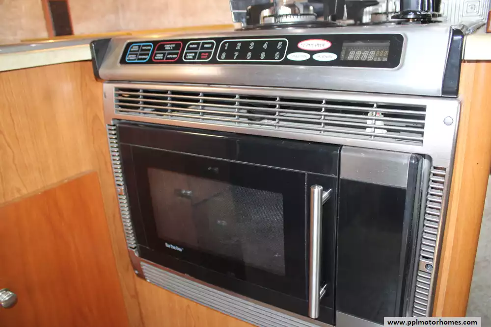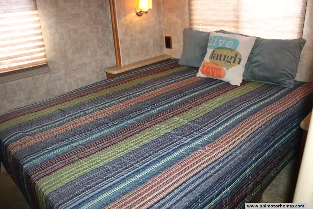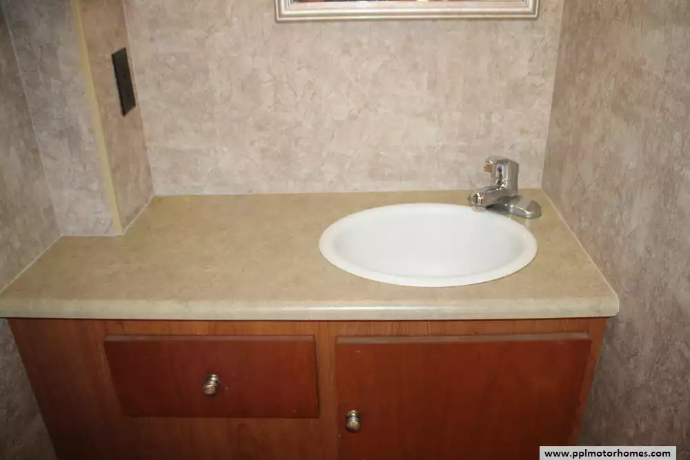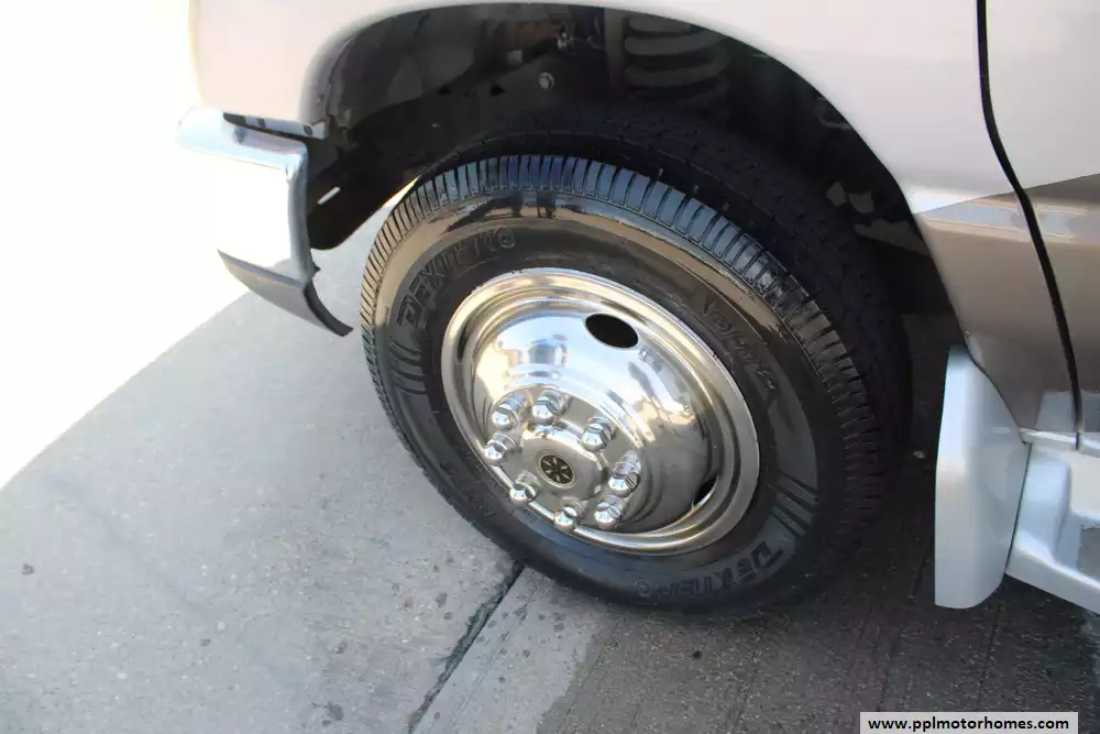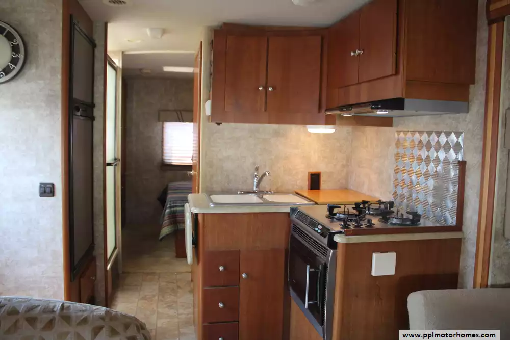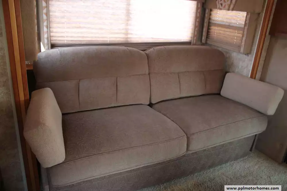 The 2009 Itasca Spirit 29B is built on a Ford E-450 chassis powered by a 6.8L Triton V10 engine delivering 305 horsepower, paired with a 5-speed TorqShift automatic transmission with overdrive, offering both robust performance and respectable tow capability of up to 5,000 lbs. Stretching at an overall length of over 30 feet long, this model comfortably sleeps up to six passengers across its queen bedroom and multiple convertible seating areas, thanks to two power slideouts that expand the living space on demand. This model features an overhead entertainment center instead of the standard overhead cab bunk. Standard amenities include a mid-size electric/propane refrigerator, a three-burner range with oven, microwave, full kitchen, and a central bathroom with a separate shower/shower curtain layout. It supports extended adventures with sizable onboard capacities: 55-gallon fuel, 42-gallon fresh water, 39-gallon gray, and 30-gallon black water tanks, plus a long 14-foot awning to bring the outdoors in. This Spirit also features full body paint, fiberglass roof, surround sound speakers, and a flip-up countertop extension.