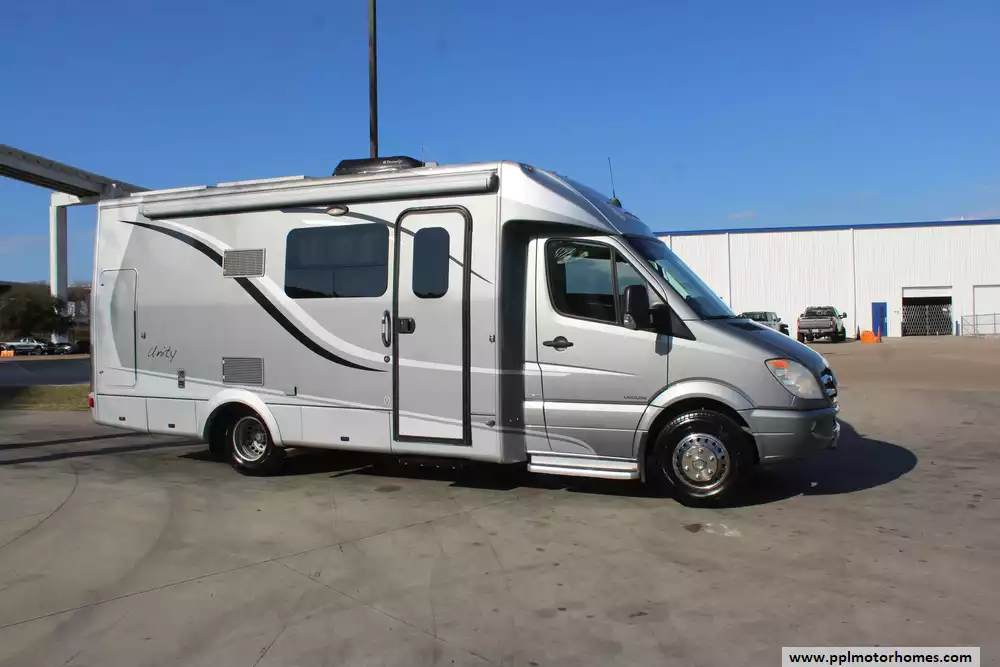 This 2013 Unity 24MB is ideal for couples or solo travelers who want upscale comforts in a relatively easy-to-drive coach. Features Include...3.0 V6 Mercedes Benz Engine On a Sprinter Chassis, 1 Slide-out, Onan Propane Generator, 1 Ducted Air Conditioner, Single Door Gas/110v/12v Dometic Refrigerator, Automatic Main Awning And Slide Awning, Backup . Camera, TV, Convection Microwave, and 2 Burner Range