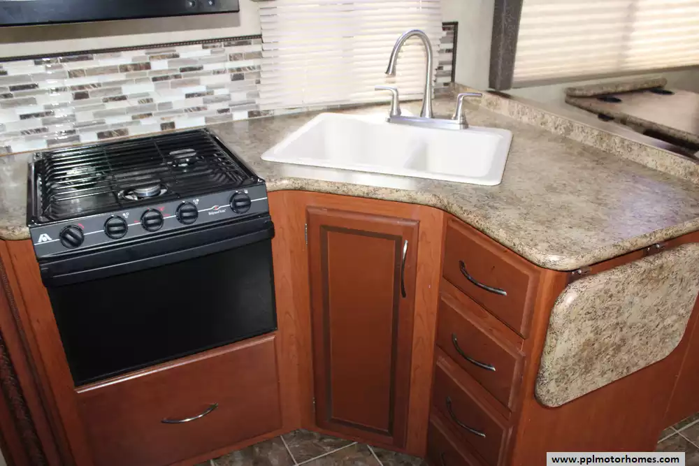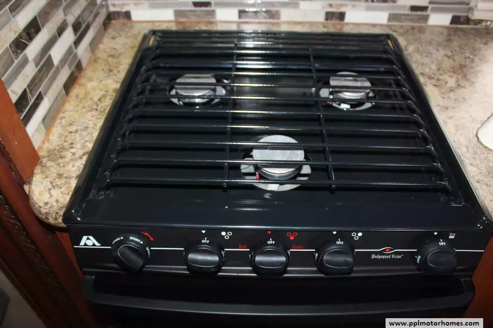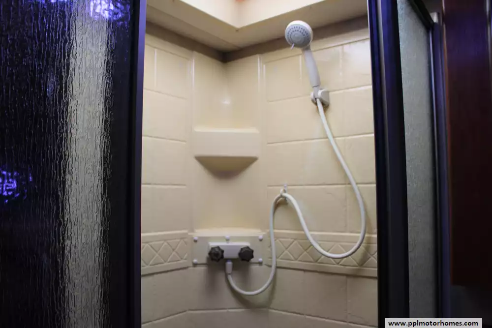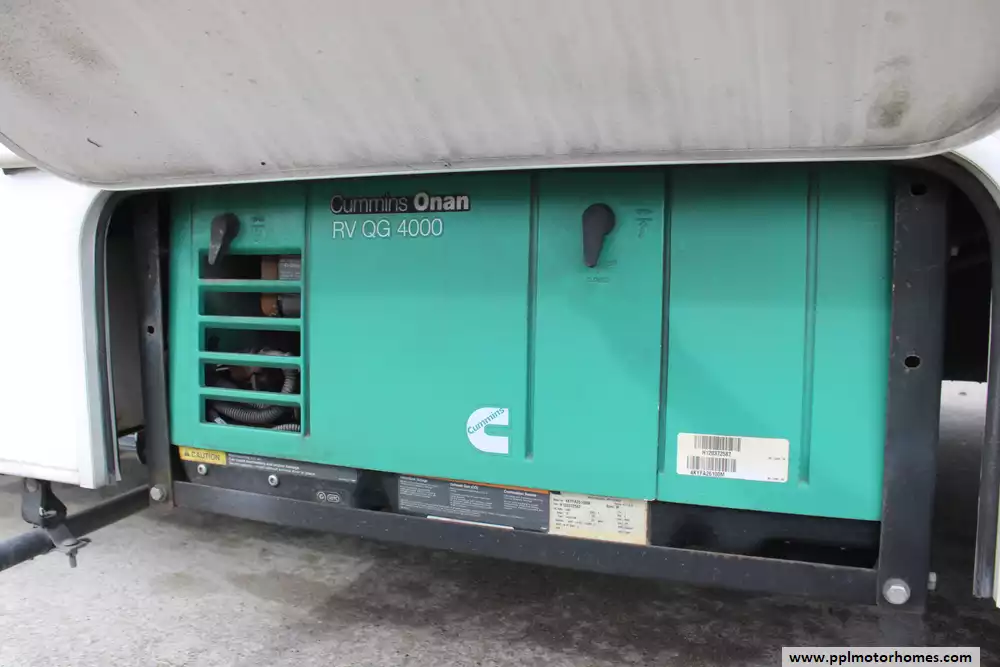 The interior is designed for ultimate climate control and convenience, featuring a unique dual-cooling setup with one ducted and one non-ducted air conditioner to keep the entire coach comfortable in any weather. The well-appointed kitchen is ready for your favorite recipes with a two-burner range, oven, microwave, and a versatile double-door gas/110v refrigerator. Whether you are relaxing in front of the TV or preparing a meal, the generous layout ensures you never feel cramped. For those who enjoy dry camping, the onboard Onan gas generator provides reliable power wherever your journey takes you.