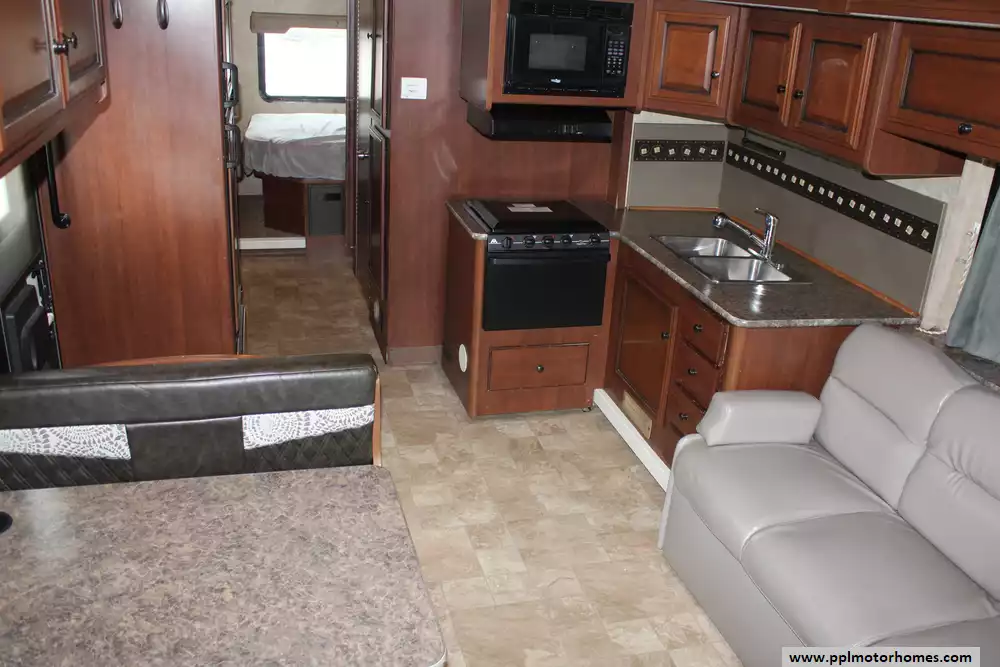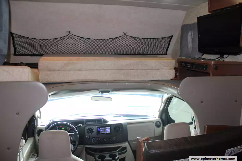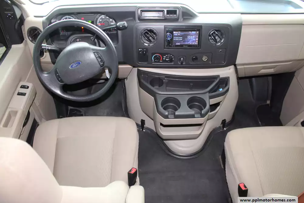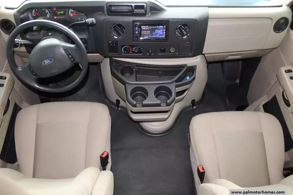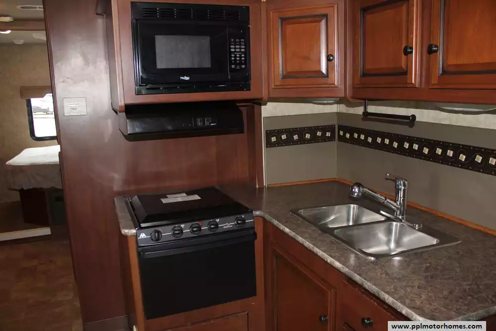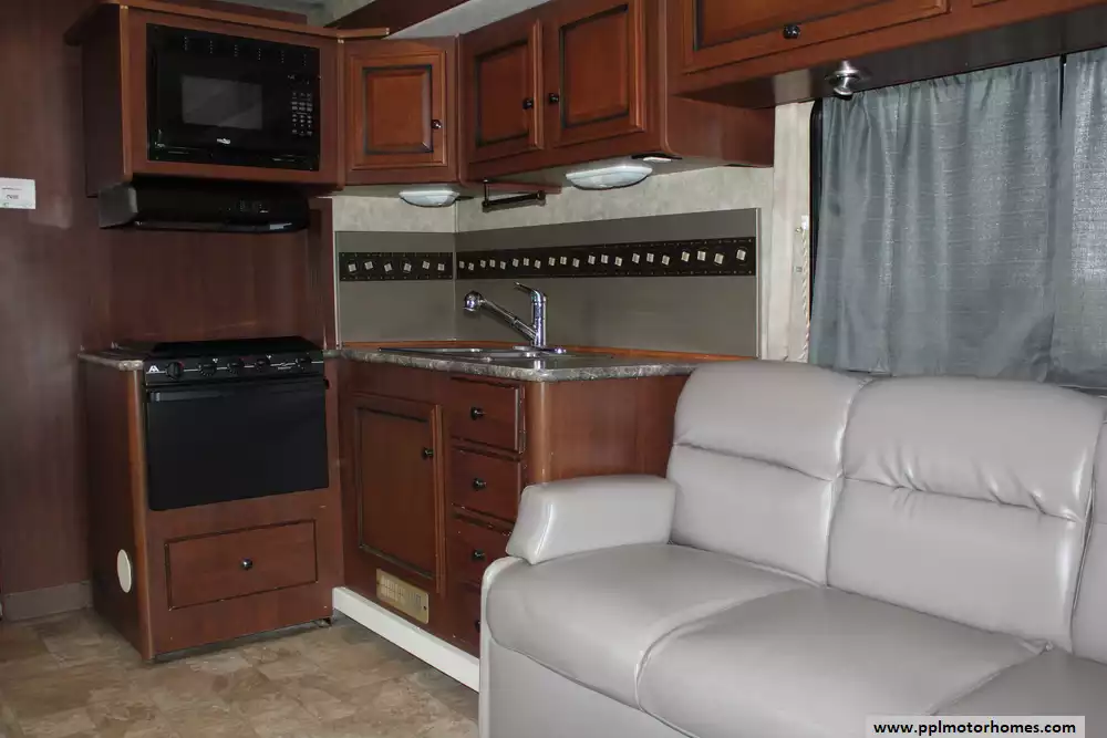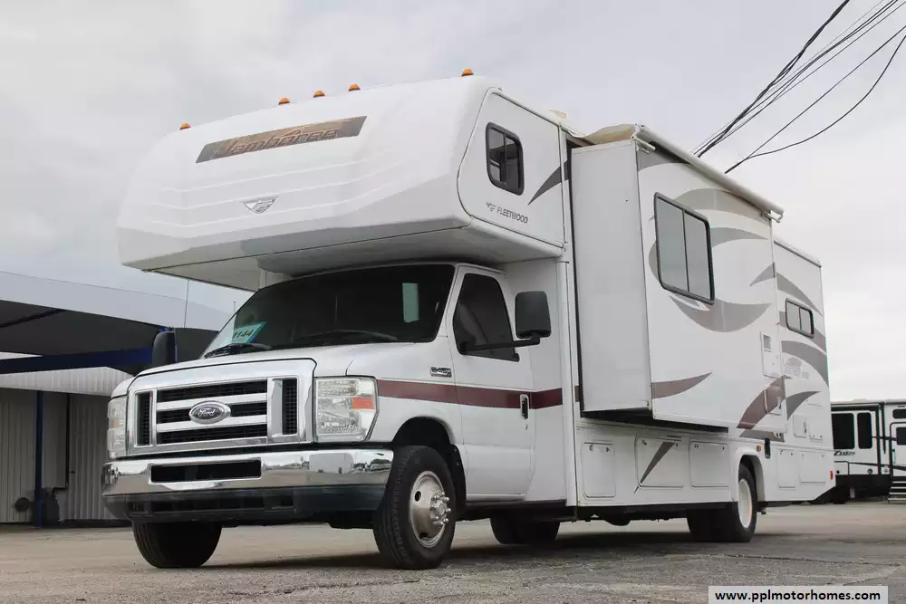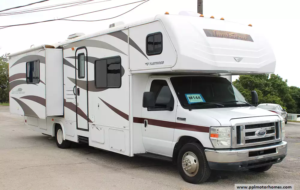 2014 Fleetwood Jamboree Sport 31M is a spacious, family-friendly Class C motorhome built on the sturdy Ford E-450 chassis with a 6.8 L Triton V10 engine delivering 305 hp. Featuring two power slide-outs and factory-installed slide toppers to protect the slide roofs, it offers a generous interior living space. Sleeping up to 8 people, accommodations include a rear queen bed, a cab-over bunk, a convertible dinette, and a sofa bed. Other highlights include a well-appointed kitchen with a 3-burner stove and oven, full refrigerator, microwave, and double sink, along with a full bathroom featuring a corner shower and linen storage.