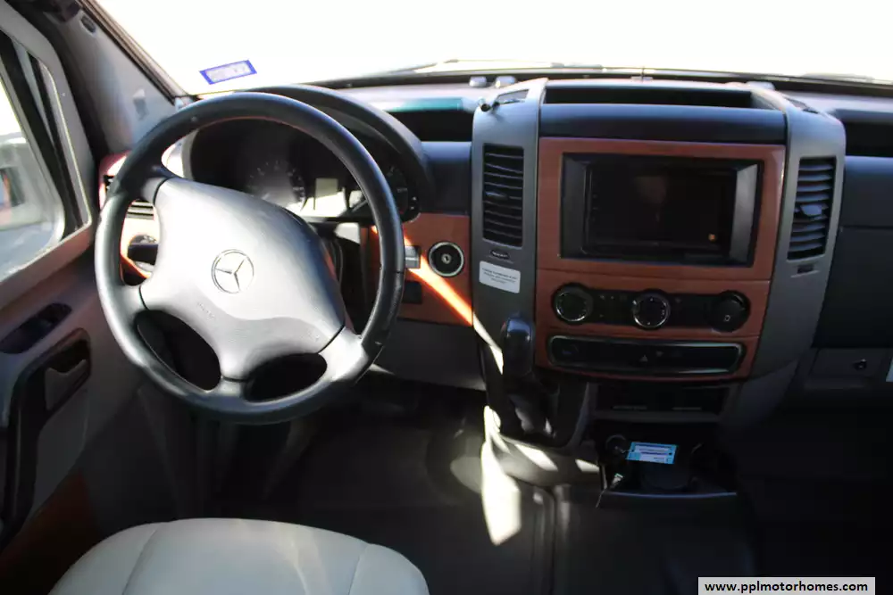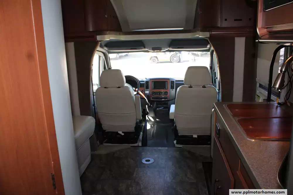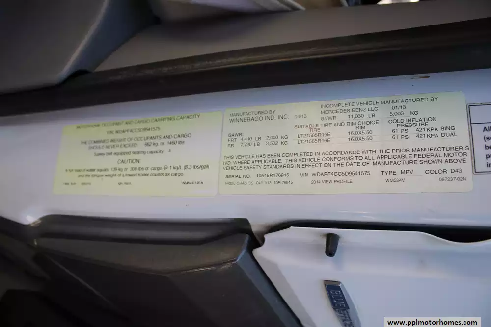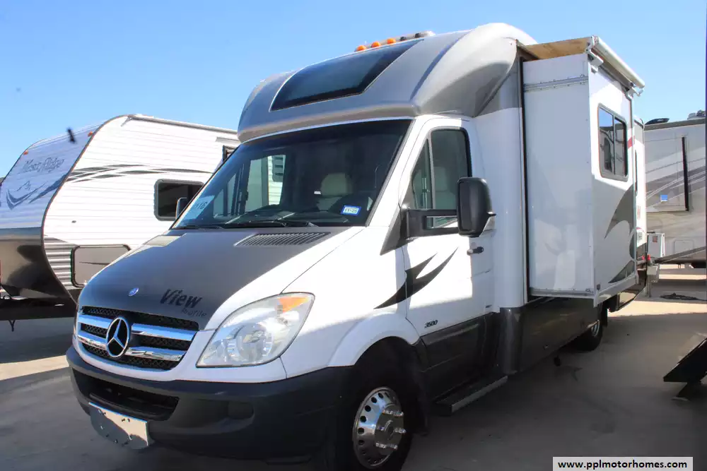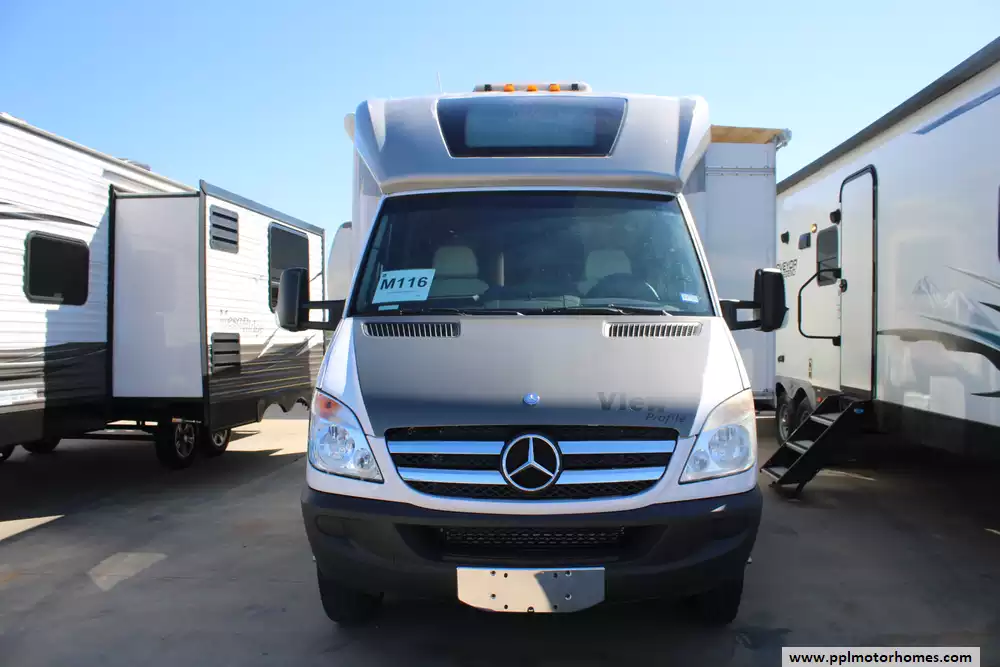 The 2014 Winnebago View Profile 24V is a compact, high-quality Class C motorhome built on a Mercedes-Benz Sprinter 3500 chassis, powered by a 3.0-liter V6 turbo-diesel engine producing 188 hp and 325 lb-ft of torque. At about 25.4 feet long, with a full-body paint finish and a single power slide, it manages to deliver surprisingly spacious living with modern comforts: a rear twin-bed configuration that converts to a king, a front slide-out sofa/bed, kitchen with double-sink and 2-burner range, bathroom with shower, and full amenities like a 3.6 kW Onan diesel generator, 1,000 W inverter, and power awning. With a GVWR of 11,030 lbs, towing capability up to 5,000 lbs, and efficient fuel consumption for its class, it offers a rare mix of agile driving, luxury finishes, and serious functionality for couples or small families on the road.
