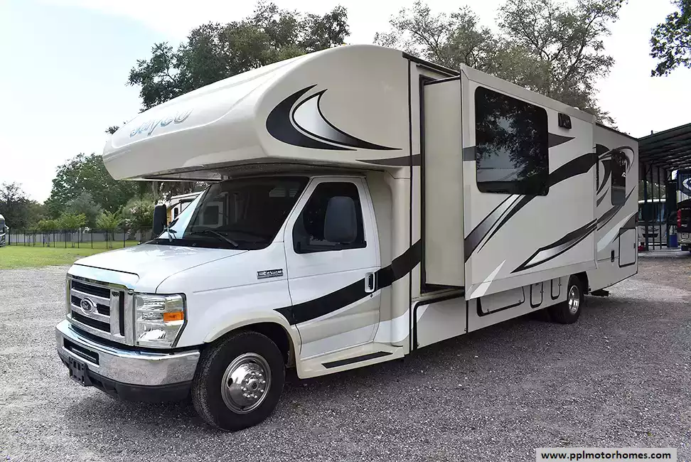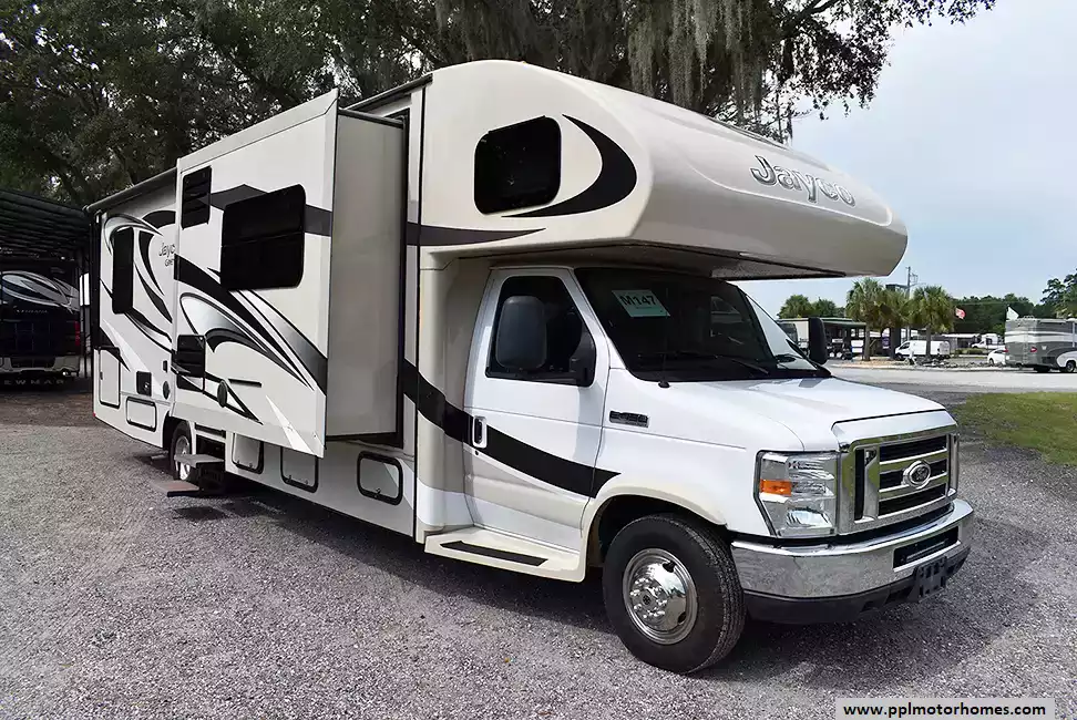 This 2015 Jayco Grayhawk 29ME has a Triton/ V10 Ford Engine On a Ford 450 Chassis, 3 Slide-outs, Onan Gas Generator, 1 Ducted Air Conditioner, Levelers, Double Door Gas/110v Norcold Refrigerator, Automatic Main Awning, Backup Camera, Outside Speakers, TV, Satellite Radio, Convection Microwave, 3 Burner Range, Oven
