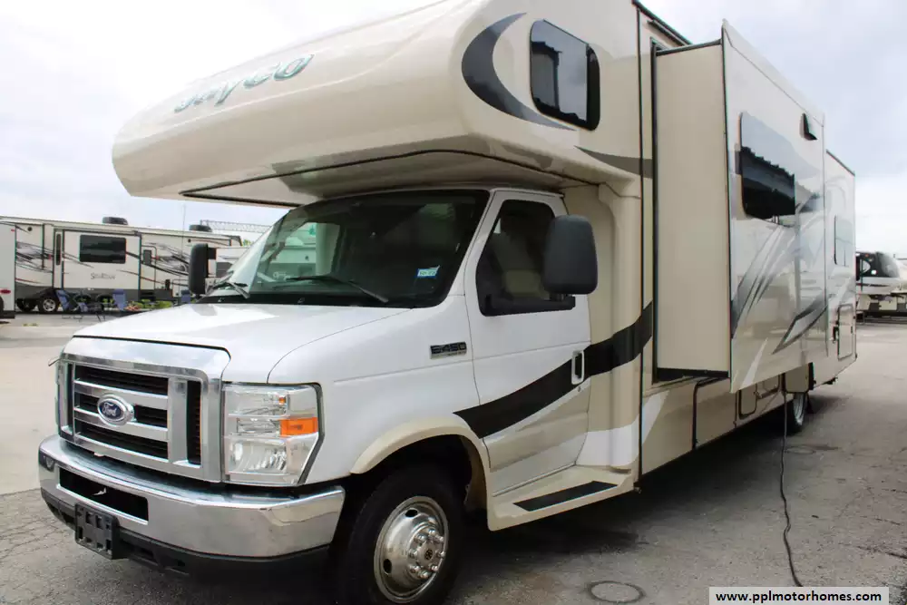 This 2015 Jayco Greyhawk 31FS has a V-10 6.8L Ford Engine On a Ford Chassis, 2 Slide-outs, Onan Gas Generator, 1 Ducted Air Conditioner, Levelers, Double Door 110V Refrigerator, Automatic Main Awning, Backup Camera, Satellite Dish & Receiver, Outside Speakers, 4 TVs, 2 DVD Players, Outside Shower, Microwave, 3 Burner Range, Oven