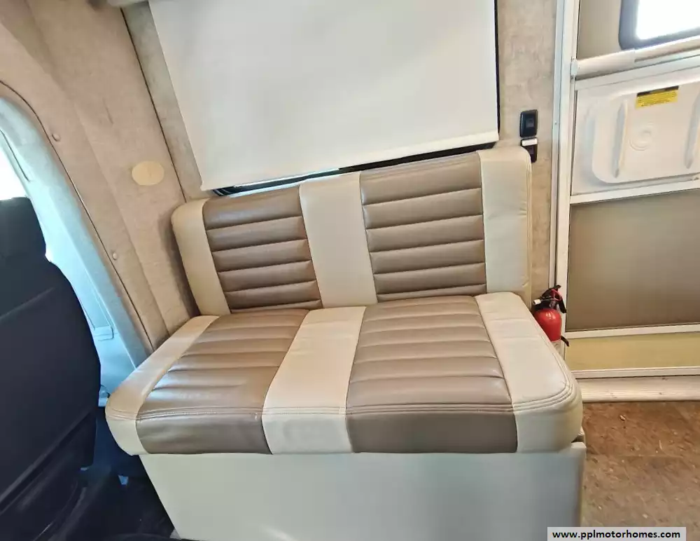 This 2015 Trend 23L is equipped with driver and passenger bucket seats that swivel to face the rear, fully integrating the cockpit into the living space for additional seating. The central feature is a dinette with a pedestal table that swivels 360 degrees and can extend. The dinette bench and a separate side bench behind the passenger seat utilize the Flex Bed System to convert into a large sleeping surface.