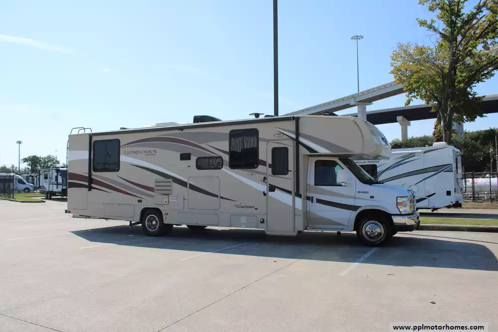 This 2016 Leprechaun 319DS is made for families or people wanting more interior room without going to a much larger coach. Features Include...6.8l V10 Ford Engine On a Ford Chassis, 2 Slide-outs, Onan Gas Generator, 1 Ducted Air Conditioner, Levelers, Double Door Gas/110v Dometic Refrigerator, Automatic Main Awning And Slide Awning, Backup Camera, Outside Entertainment System, 2 TVs, Outside Shower, Convection Microwave, 3 Burner Range, and Oven.