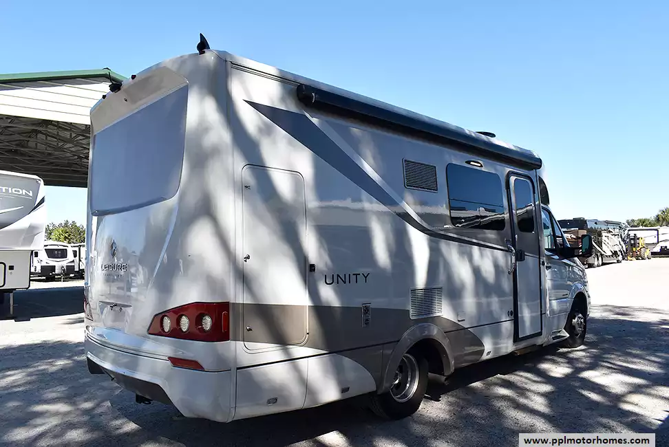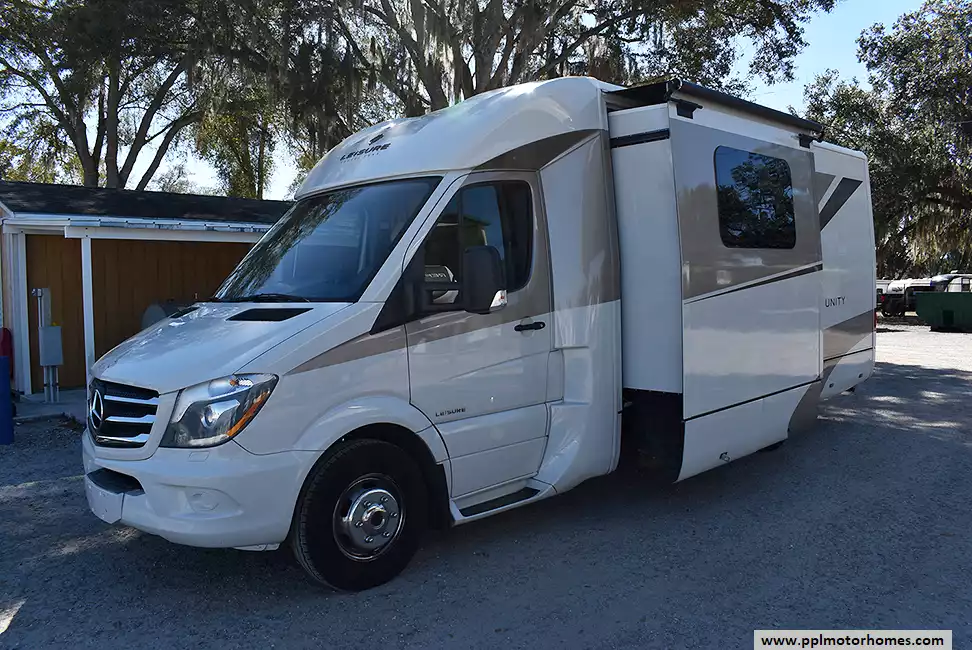 This 2016 Unity Series 24MB has a 3.0 V6 Mercedes Benz Engine On a Sprinter Chassis, 1 Slide-out, Onan Propane Generator, 1 Ducted Air Conditioner, Single Door 110v Lg Refrigerator, Automatic Main Awning And Slide Awning, Backup Camera, Solar Panel, Satellite Receiver, TV, DVD Player, Outside Shower, Convection Microwave, 2 Burner Range