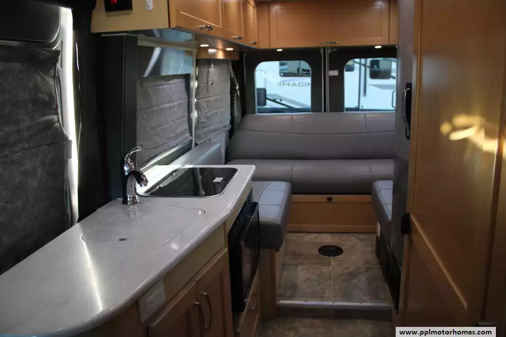 The 2016 Pleasure-Way Lexor TS is a compact Class B motorhome built on the Ram ProMaster 3500 chassis, about 20' 11" long, that delivers easy drivability and a surprisingly well-equipped living space. Inside, it offers a functional galley with a two-burner LP cooktop, stainless sink, refrigerator, and a wet bath with shower, toilet, and sink, making it fully self-contained for short or extended trips. Seating and sleeping are handled with an electric sofa that converts into a comfortable bed, plus useful storage and amenities like a V-6 engine, 24-gal fuel tank, and 29-gal fresh-water capacity, striking a good balance between comfort and compactness for two people or a couple. Honorable mentions include upgrades batteries (two 100Ah Eco-ion lithium batteries), tankless water heating system, all-terrain tires, and the current seller has added insulated window shades.
