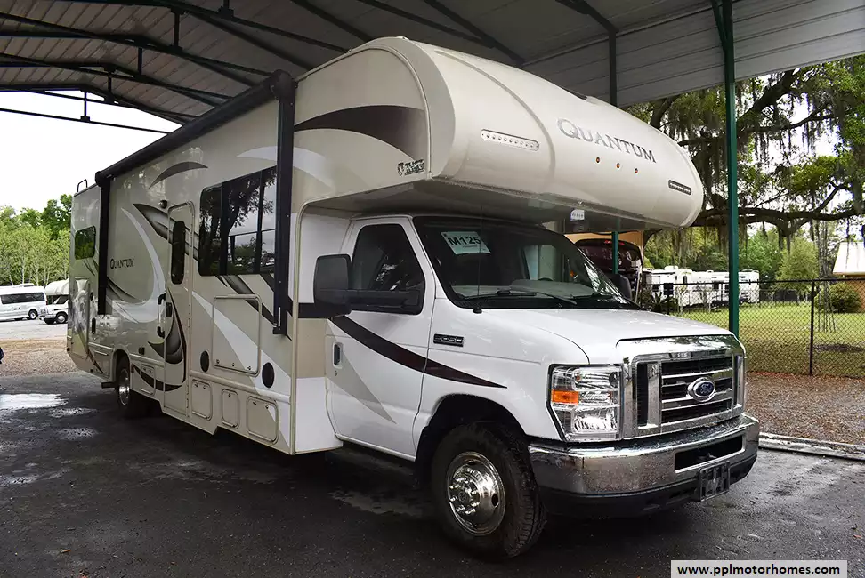 This 2016 Quantum WS31 has a Triton V10 Ford Engine On a Ford 450 Chassis, 1 Slide-out, Onan Gas Generator, 1 Ducted Air Conditioner, Levelers, Double Door Residential Whirlpool Refrigerator, In-Fridge Ice Maker, Automatic Main Awning, Backup Camera, GPS System, Outside Speakers, 2 TVs, DVD Player, Outside Shower, Convection Microwave, 3 Burner Range, Oven