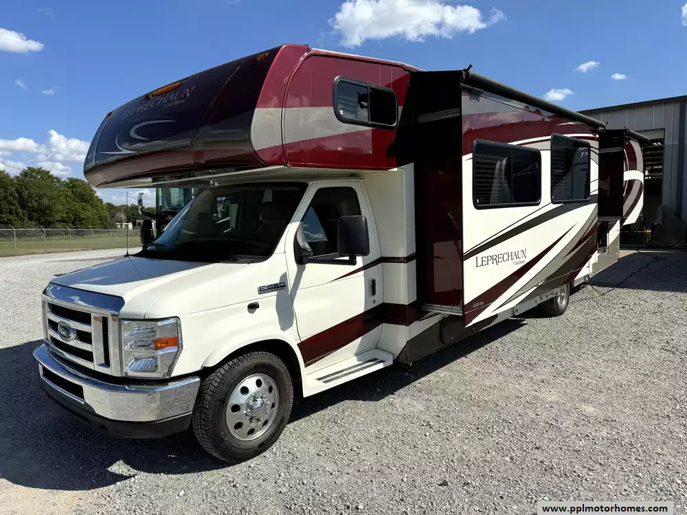 This 2017 Leprechaun 319MB has a 6.8l Ford Engine On a Ford 450 Chassis, Air Bag Suspension, 2 Slide-outs, Kohler Gas Generator, 1 Ducted Air Conditioner, Levelers, Double Door Gas/110v Dometic Refrigerator, Automatic Main Awning And Door Awning, Backup Camera, GPS System, Heated Tanks, Satellite Dish & Receiver, Outside Entertainment System, 3 TVs, Outdoor Grill, Outdoor Kitchen, Outside Shower, Fireplace, Convection Microwave, 3 Burner Range, Oven