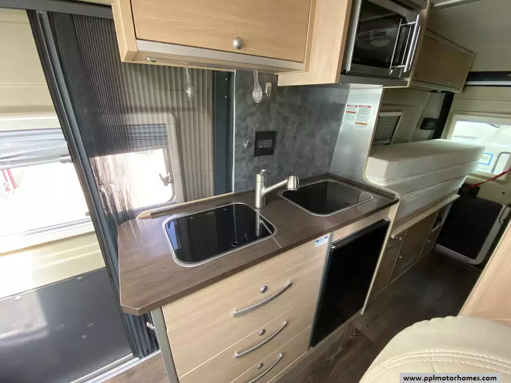 Step inside to discover a bright, modern interior that maximizes every inch of living space for a premium travel experience. The well-equipped galley features a single-door Dometic refrigerator, a microwave, and a two-burner range, ensuring you have everything needed for gourmet meals on the road. For your entertainment needs, this van comes fully loaded with a TV, DVD player, and a satellite dish, providing a cozy and connected atmosphere wherever you choose to camp. Whether you are navigating narrow city streets or winding scenic highways, this Aktiv 1.0 delivers a versatile, sales-ready solution for your next great journey.