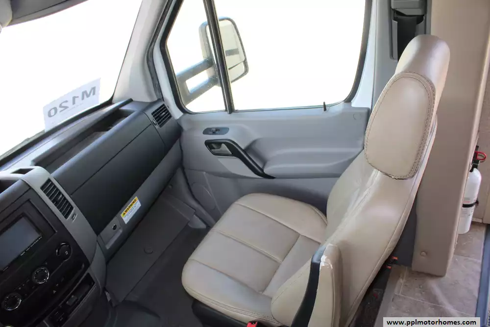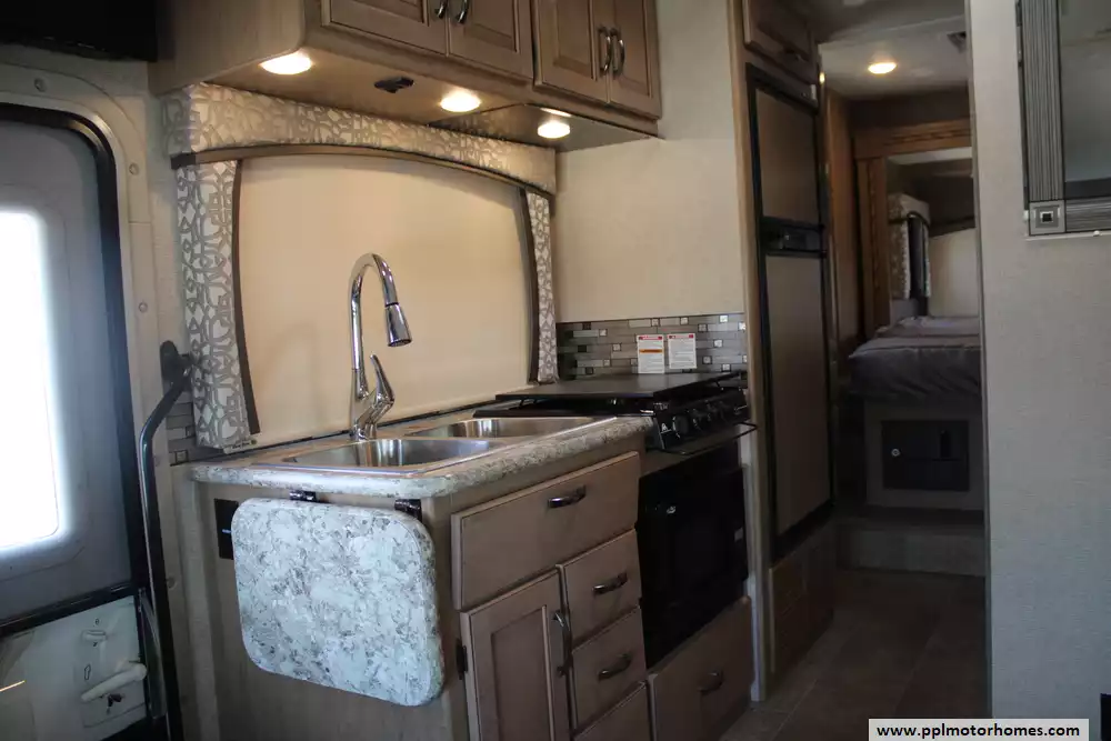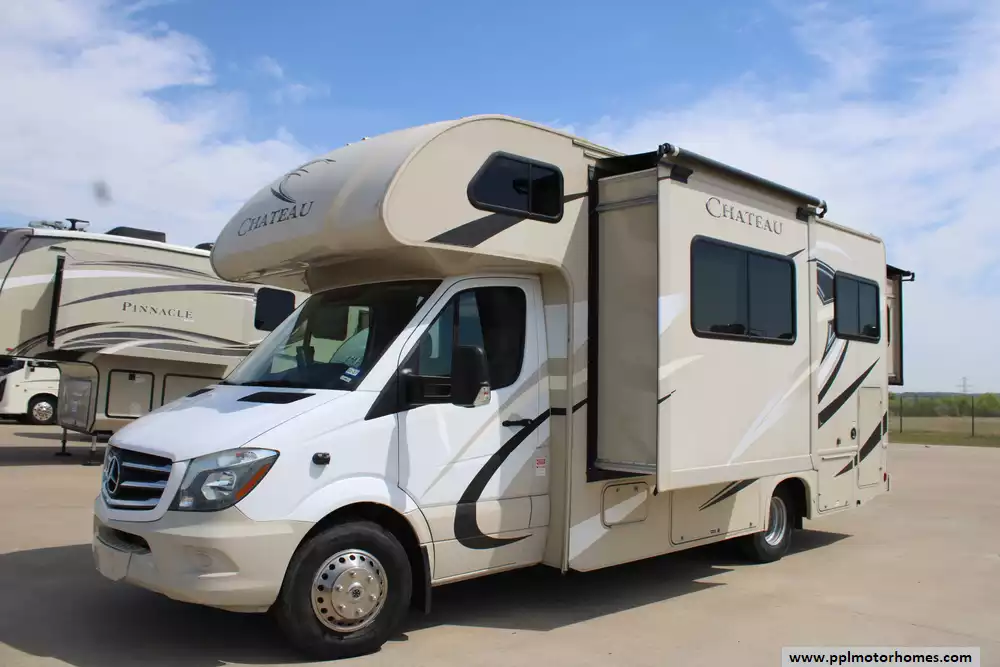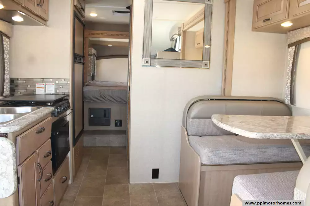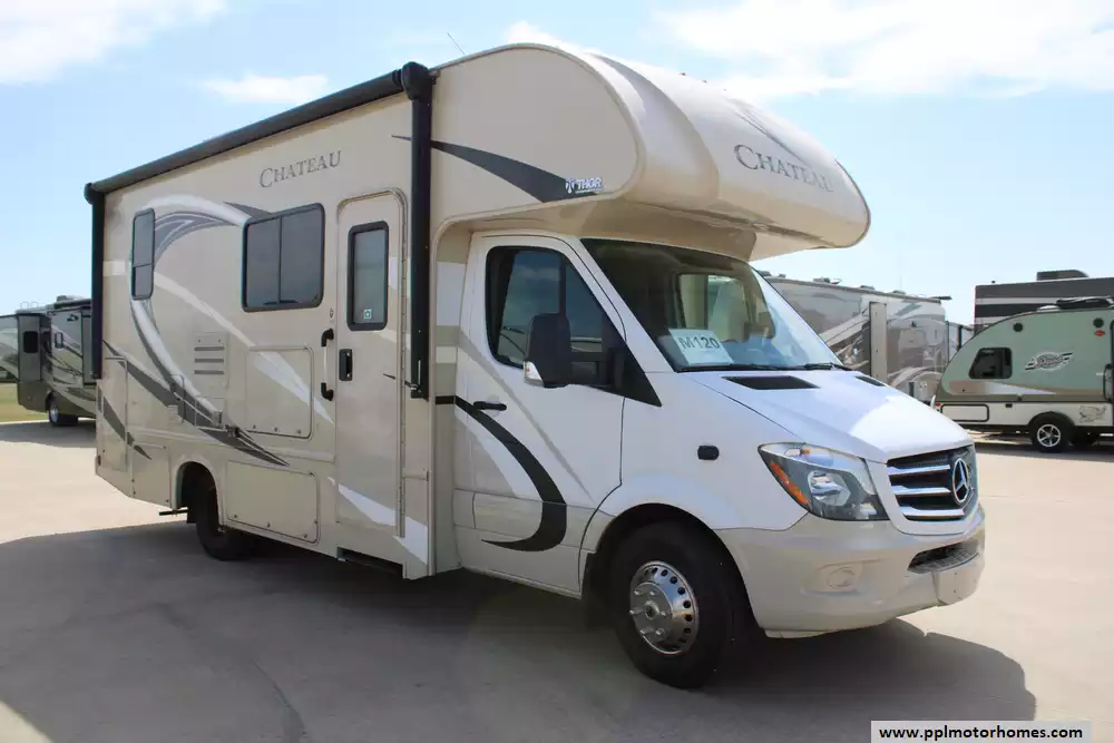 The 2018 Thor Motor Coach Chateau 24HL is a compact Class C motorhome built on a Mercedes-Benz Sprinter 3500 chassis, offering a balance of maneuverability and upscale amenities in a roughly 25-foot layout. Powered by a 3.0L V6 turbo diesel engine producing about 188 horsepower, it delivers reliable performance and solid fuel efficiency for long-distance travel. Inside, the 24HL features two slide-outs that expand the living space, accommodating up to six occupants with a rear queen bed, convertible dinette, and cab-over sleeping area. The coach includes a fully equipped kitchen with a three-burner cooktop, convection microwave, and mid-size refrigerator, along with a full bathroom and ample storage throughout. Additional highlights include a 13,500 BTU air conditioning system, rear and side cameras, onboard generator, tankless water heater, and modern entertainment options, making it a well-rounded option for couples or small families seeking comfort and drivability in a smaller RV package.