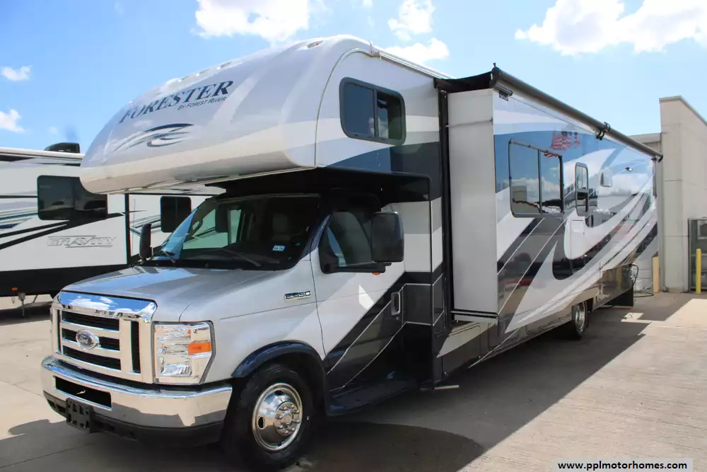 The 2019 Forest River Forester 3051S is a versatile and well-appointed Class C motorhome built on the Ford E-450 Triton V10 chassis, offering 305 hp and a 7,500 lb towing capacity . At just under 32 ft long and 11'3" tall, it boasts a full-wall slide-out that expands a bright living area featuring a booth dinette, sofa, and well-equipped kitchen with a 10 cu ft 12-volt stainless fridge, convection microwave, pantry, and flip-up countertop. A walk-through split bathroom separates the rear private bedroom, complete with a queen bed, wardrobes, nightstand, linen closet, and TV, from the rest of the coach. With 44 gal fresh, 39 gal gray, and 39 gal black tanks, plus amenities like a power awning, exterior entertainment, sophisticated cab tech (backup and side-view cameras), ducted A/C, generator, and smart storage, the 3051S delivers comfort, style, and full-time livability in a compact, towable package.