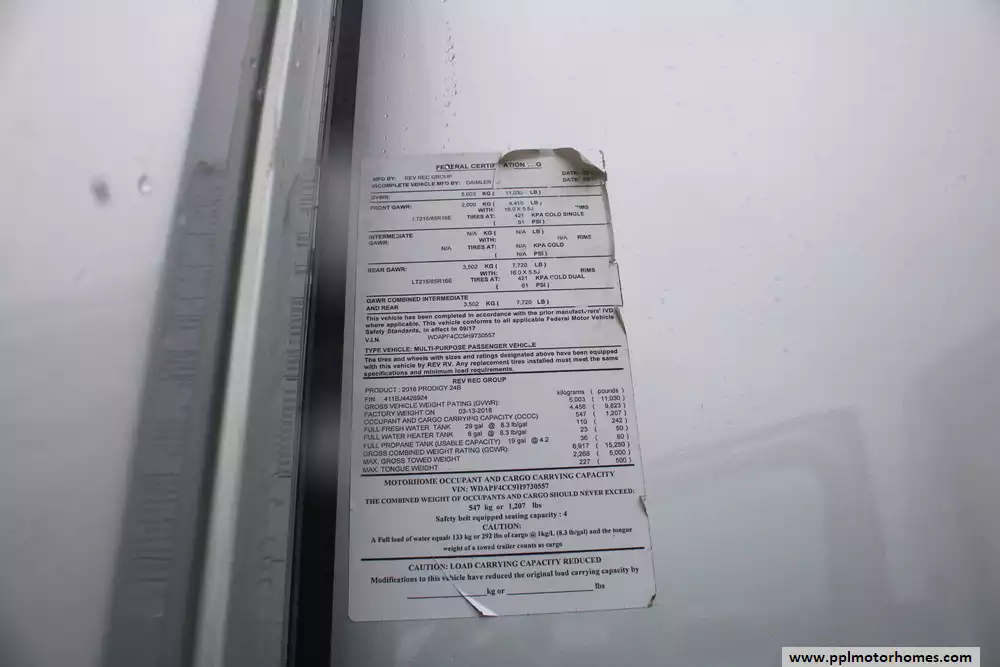 The 2019 Holiday Rambler Prodigy 24B is a stylish and versatile Class C diesel coach built on a Mercedes-Benz Sprinter 3500 chassis, powered by a turbocharged 3.0 L V6 diesel engine producing 188 hp and 325 ft-lb of torque . At about 25 ft long with a single, fully-automatic slideout and a power awning, it offers a comfortable living space that sleeps up to six, featuring a queen bed in the rear, bunk over the cab, and convertible dinette. The coach includes a full rear bath, mid-kitchen with stainless appliances, two-burner stove, mid-size fridge, and a cab-over entertainment system, along with a 3,200-watt diesel generator, hydraulic disc brakes, and Mercedes reliability . Its construction, aluminum and fiberglass with Holiday Rambler's "Powerlock" integrated wall system, plus ample interior and exterior storage make it a rugged yet refined offering for families or couples seeking adventure with confidence.